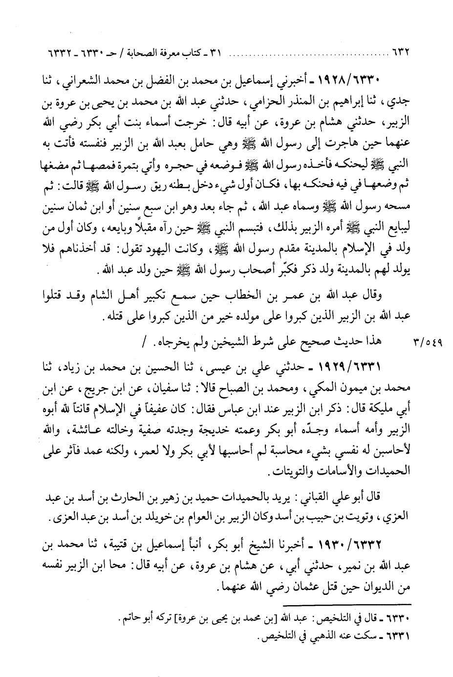 6331 - حَدَّثَنِي عَلِيُّ بْنُ عِيسَى، ثَنَا الْحُسَيْنُ بْنُ مُحَمَّدِ بْنِ زِيَادٍ، ثَنَا مُحَمَّدُ بْنُ مَيْمُونٍ الْمَكِّيُّ، وَمُحَمَّدُ بْنُ الصَّبَّاحِ، قَالَا: ثَنَا سُفْيَانُ، عَنِ ابْنِ جُرَيْجٍ، عَنِ ابْنِ أَبِي مُلَيْكَةَ، قَالَ: ذُكِرَ ابْنُ الزُّبَيْرِ عِنْدَ ابْنِ عَبَّاسٍ فَقَالَ: «§كَانَ عَفِيفًا فِي الْإِسْلَامِ، قَانِتًا لِلَّهِ، أَبُوهُ الزُّبَيْرُ، وَأُمُّهُ أَسْمَاءُ، وَجَدُّهُ أَبُو بَكْرٍ، وَعَمَّتُهُ خَدِيجَةُ، وَجَدَّتُهُ صَفِيَّةُ، وَخَالَتُهُ عَائِشَةُ، وَاللَّهِ لَأُحَاسِبَنَّ لَهُ نَفْسِي بِشَيْءٍ مُحَاسَبَةً لَمْ أُحَاسِبْهَا لِأَبِي بَكْرٍ وَلَا لِعُمَرَ، وَلَكِنَّهُ عَمَدَ فَآثَرَ عَلَى الْحُمَيْدَاتِ وَالْأُسَامَاتِ وَالتُّوَيْتَاتُ» ، قَالَ أَبُو عَلِيٍّ الْقَبَّانِيُّ: «يُرِيدُ بِالْحُمَيْدَاتِ حُمَيْدَ بْنَ زُهَيْرِ بْنِ الْحَارِثِ بْنِ أَسَدِ بْنِ عَبْدِ الْعُزَّى، وَتُوَيْتُ بْنُ حَبِيبِ بْنِ أَسَدٍ، وَكَانَ الزُّبَيْرُ بْنُ الْعَوَّامِ بْنِ خُوَيْلِدِ بْنِ أَسَدِ بْنِ عَبْدِ الْعُزَّى» K6331 - سكت عنه الذهبي في التلخيص