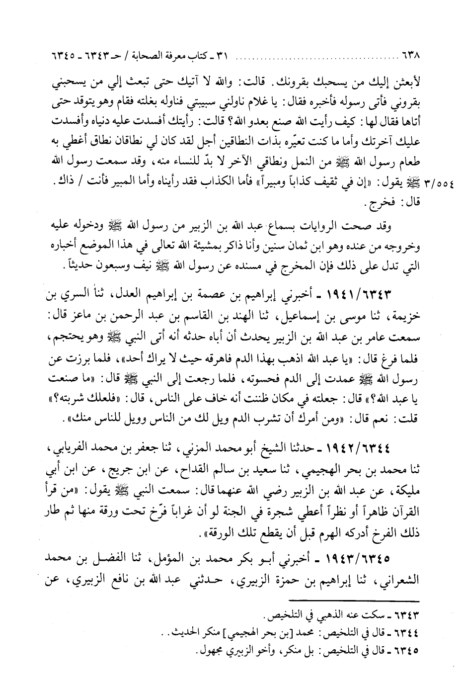 6345 - أَخْبَرَنِي أَبُو بَكْرٍ مُحَمَّدُ بْنُ الْمُؤَمَّلِ، ثَنَا الْفَضْلُ بْنُ مُحَمَّدٍ الشَّعْرَانِيُّ، ثَنَا إِبْرَاهِيمُ بْنُ حَمْزَةَ الزُّبَيْرِيُّ، حَدَّثَنِي عَبْدُ اللَّهِ بْنُ نَافِعٍ الزُّبَيْرِيُّ، عَنْ أَخِيهِ، عَنْ أَبِيهِ، عَنْ عَبْدِ اللَّهِ بْنِ الزُّبَيْرِ رَضِيَ اللَّهُ عَنْهُمَا قَالَ: §«بَايَعْتُ رَسُولَ اللَّهِ صَلَّى اللهُ عَلَيْهِ وَسَلَّمَ فِي يَوْمٍ مَرَّتَيْنِ» هَذَا حَدِيثٌ صَحِيحُ الْإِسْنَادِ، وَلَمْ يُخَرِّجَاهُ، وَقَدْ ذَكَرْتُ أَوَّلَ التَّرْجَمَةِ بَيْعَتَهُ وَهُوَ ابْنُ ثَمَانِ سِنِينَ وَضَحِكَ رَسُولُ اللَّهِ صَلَّى اللهُ عَلَيْهِ وَسَلَّمَ وَتَعَجُّبَهُ مِنْهُ "K6345 - بل منكر
