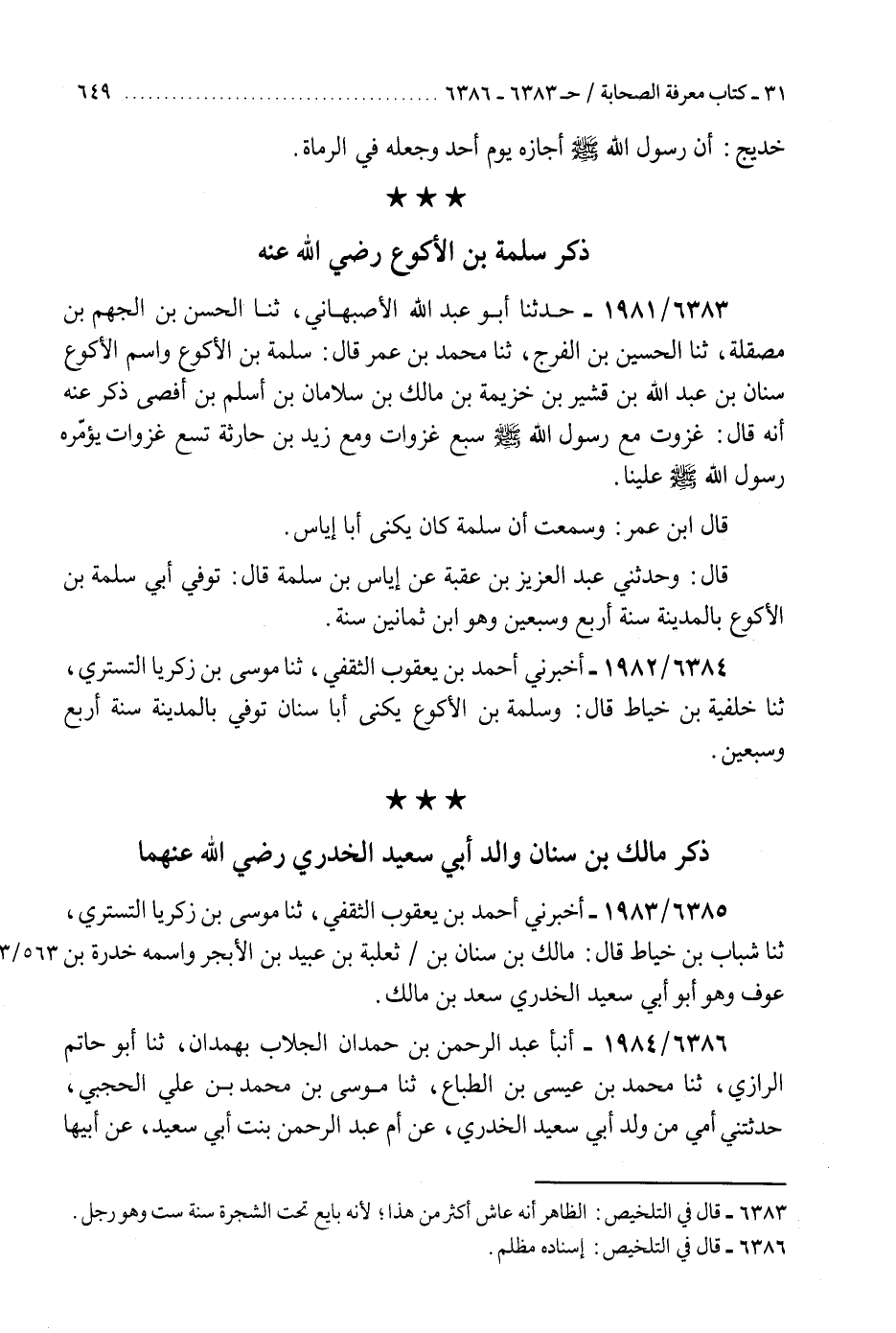 6383 - حَدَّثَنَا أَبُو عَبْدِ اللَّهِ الْأَصْبَهَانِيُّ، ثَنَا الْحَسَنُ بْنُ الْجَهْمِ بْنِ مَصْقَلَةَ، ثَنَا الْحُسَيْنُ بْنُ الْفَرَجِ، ثَنَا مُحَمَّدُ بْنُ عُمَرَ، قَالَ: سَلَمَةُ بْنُ الْأَكْوَعِ وَاسْمُ الْأَكْوَعِ سِنَانُ بْنُ عَبْدِ اللَّهِ بْنُ قُشَيْرِ بْنِ خُزَيْمَةَ بْنِ مَالِكِ بْنِ سَلَامَانَ بْنِ أَسْلَمَ بْنِ أَفْصَى ذُكِرَ عَنْهُ أَنَّهُ قَالَ: §«غَزَوْتُ مَعَ رَسُولِ اللَّهِ صَلَّى اللهُ عَلَيْهِ وَسَلَّمَ سَبْعَ غَزَوَاتٍ» ، وَمَعَ زَيْدِ بْنِ حَارِثَةَ تِسْعَ غَزَوَاتٍ يُؤَمِّرُهُ رَسُولُ اللَّهِ صَلَّى اللهُ عَلَيْهِ وَسَلَّمَ عَلَيْنَا