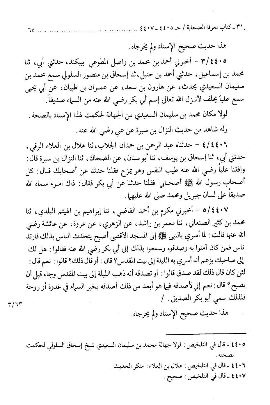4405 - أَخْبَرَنِي أَحْمَدُ بْنُ مُحَمَّدِ بْنِ وَاصِلٍ الْمُطَّوِّعِيُّ، بِبِيكَنْدَ، حَدَّثَنِي أَبِي، ثنا مُحَمَّدُ بْنُ إِسْمَاعِيلَ، حَدَّثَنِي أَحْمَدُ بْنُ حَنْبَلٍ، ثنا إِسْحَاقُ بْنُ مَنْصُورٍ السَّلُولِيُّ، سَمِعَ مُحَمَّدَ بْنَ سُلَيْمَانَ الْعَبْدِيَّ يُحَدِّثُ، عَنْ هَارُونَ بْنِ سَعْدٍ، عَنْ عِمْرَانَ بْنِ ظَبْيَانَ، عَنْ أَبِي يَحْيَى، سَمِعَ عَلِيًّا §«يَحْلِفُ لَأَنْزَلَ اللَّهُ تَعَالَى اسْمَ أَبِي بَكْرٍ رَضِيَ اللَّهُ عَنْهُ مِنَ السَّمَاءِ صِدِّيقًا» لَوْلَا مَكَانُ مُحَمَّدِ بْنِ سُلَيْمَانَ السَّعِيدِيِّ مِنَ الْجَهَالَةِ لَحَكَمْتُ لِهَذَا الْإِسْنَادِ بِالصِّحَّةِ «وَلَهُ شَاهِدٌ مِنْ حَدِيثِ النَّزَّالِ بْنِ سَبْرَةَ، عَنْ عَلِيٍّ رَضِيَ اللَّهُ عَنْهُ» K4405 - لولا جهالة محمد بن سليمان السعيدي شيخ إسحاق السلولي لحكمت بصحته