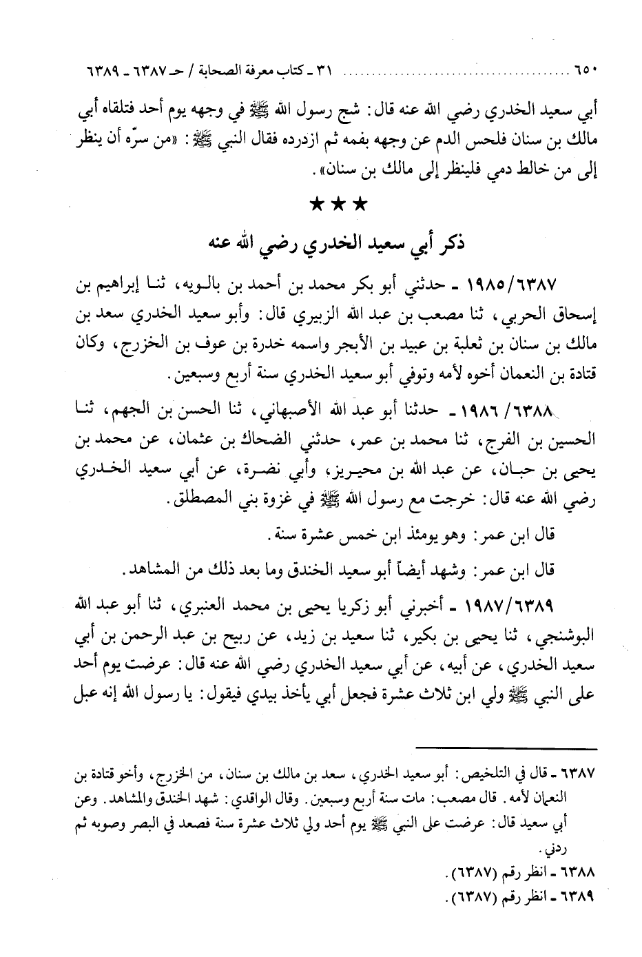 6387 - حَدَّثَنِي أَبُو بَكْرٍ مُحَمَّدُ بْنُ أَحْمَدَ بْنِ بَالَوَيْهِ، ثَنَا إِبْرَاهِيمُ بْنُ إِسْحَاقَ الْحَرْبِيُّ، ثَنَا مُصْعَبُ بْنُ عَبْدِ اللَّهِ الزُّبَيْرِيُّ قَالَ: §«وَأَبُو سَعِيدِ الْخُدْرِيُّ سَعْدُ بْنُ مَالِكِ بْنِ سِنَانِ بْنِ ثَعْلَبَةَ بْنِ عُبَيْدِ بْنِ الْأَبْجَرِ، وَاسْمُهُ خُدْرَةُ بْنُ عَوْفِ بْنِ الْخَزْرَجِ، وَكَانَ قَتَادَةَ بْنَ النُّعْمَانِ أَخُوهُ لِأُمِّهِ، وَتُوُفِّيَ أَبُو سَعِيدٍ الْخُدْرِيُّ سَنَةَ أَرْبَعٍ وَسَبْعِينَ»