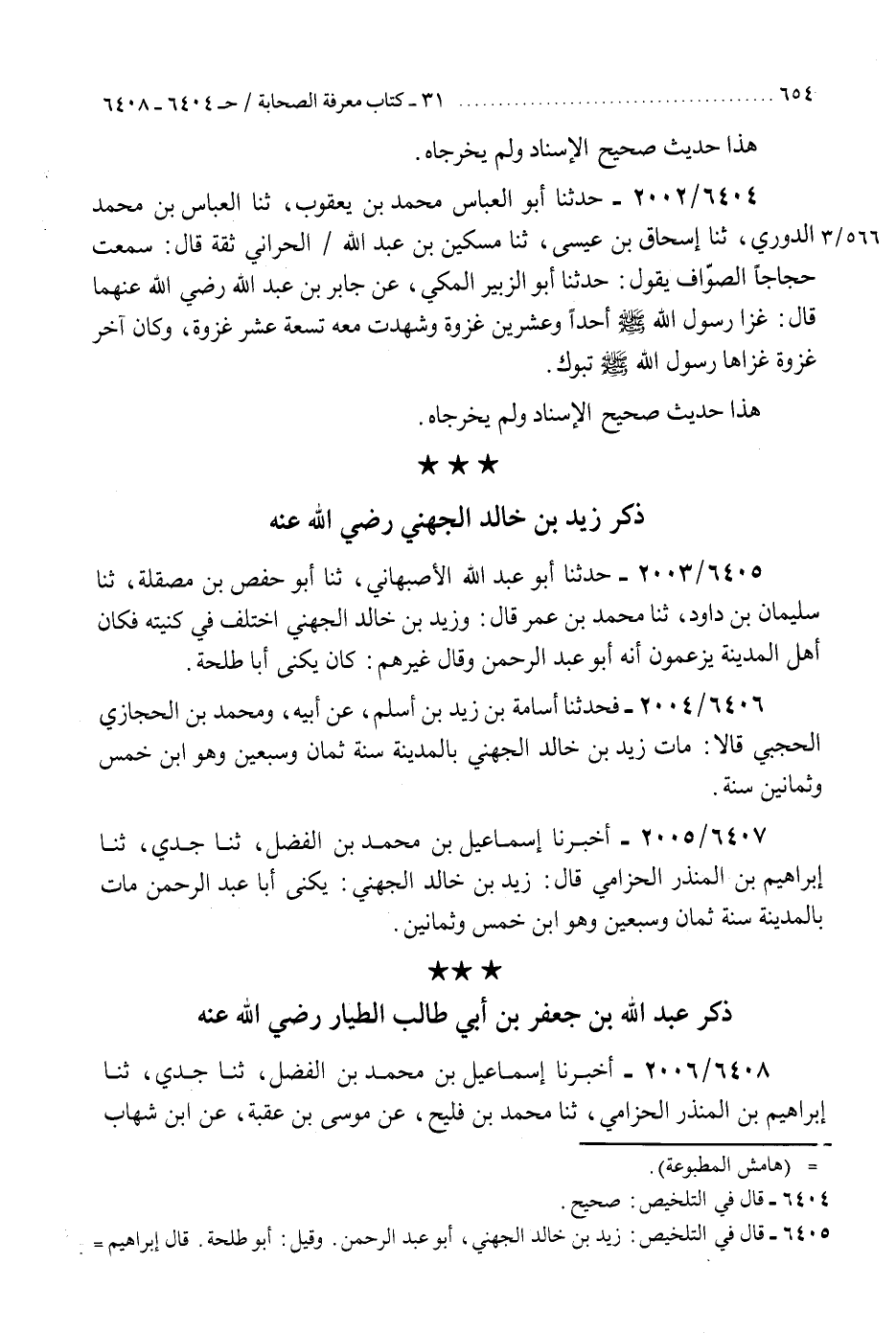 6404 - حَدَّثَنَا أَبُو الْعَبَّاسِ مُحَمَّدُ بْنُ يَعْقُوبَ، ثَنَا الْعَبَّاسُ بْنُ مُحَمَّدٍ الدُّورِيُّ، ثَنَا إِسْحَاقُ بْنُ عِيسَى، ثَنَا مِسْكِينُ بْنُ عَبْدِ اللَّهِ الْحَرَّانِيُّ ثِقَةٌ، قَالَ: سَمِعْتُ حَجَّاجًا الصَّوَّافُ، يَقُولُ: حَدَّثَنَا أَبُو الزُّبَيْرِ الْمَكِّيُّ، عَنْ جَابِرِ بْنِ عَبْدِ اللَّهِ رَضِيَ اللَّهُ عَنْهُمَا، قَالَ: §«غَزَا رَسُولُ اللَّهِ صَلَّى اللهُ عَلَيْهِ وَسَلَّمَ إِحْدَى وَعِشْرِينَ غَزْوَةً، وَشَهِدْتُ مَعَهُ تِسْعَ عَشْرَةَ غَزْوَةً، وَكَانَ آخِرُ غَزْوَةٍ غَزَاهَا رَسُولُ اللَّهِ صَلَّى اللهُ عَلَيْهِ وَسَلَّمَ تَبُوكَ» هَذَا حَدِيثٌ صَحِيحُ الْإِسْنَادِ، وَلَمْ يُخَرِّجَاهُ "K6404 - صحيح