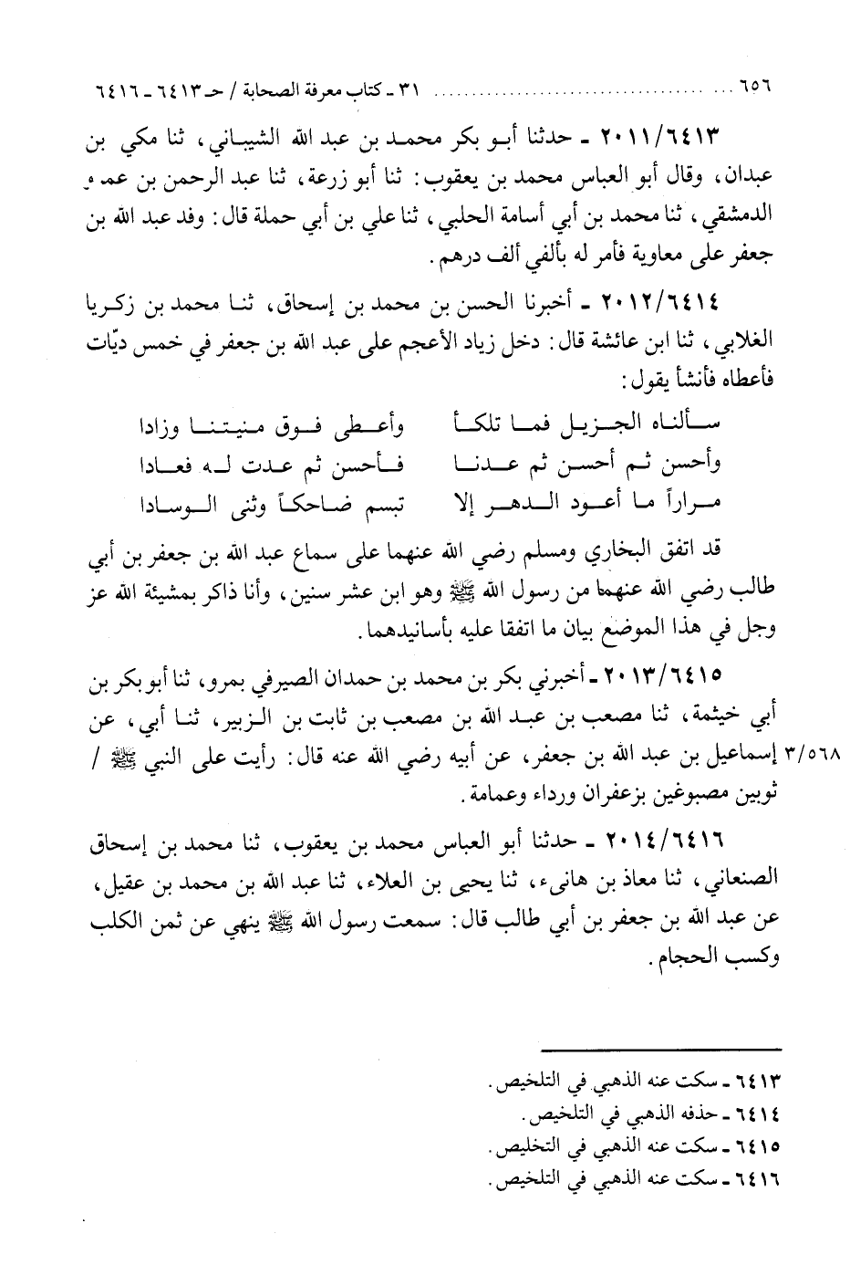 6413 - حَدَّثَنَا أَبُو بَكْرٍ مُحَمَّدُ بْنُ عَبْدِ اللَّهِ الشَّيْبَانِيُّ، ثَنَا مَكِّيُّ بْنُ عَبْدَانَ، وَقَالَ أَبُو الْعَبَّاسِ مُحَمَّدُ بْنُ يَعْقُوبَ: ثَنَا أَبُو زُرْعَةَ عَبْدُ الرَّحْمَنِ بْنُ عَمْرٍو الدِّمَشْقِيُّ، ثَنَا مُحَمَّدُ بْنُ أَبِي أُسَامَةَ الْحَلَبِيُّ، ثَنَا عَلِيُّ بْنُ أَبِي حَمَلَةَ قَالَ: §«وَفَدَ عَبْدُ اللَّهِ بْنُ جَعْفَرٍ عَلَى مُعَاوِيَةَ فَأَمَرَ لَهُ بِأَلْفَيْ أَلْفِ دِرْهَمٍ» K6413 - سكت عنه الذهبي في التلخيص