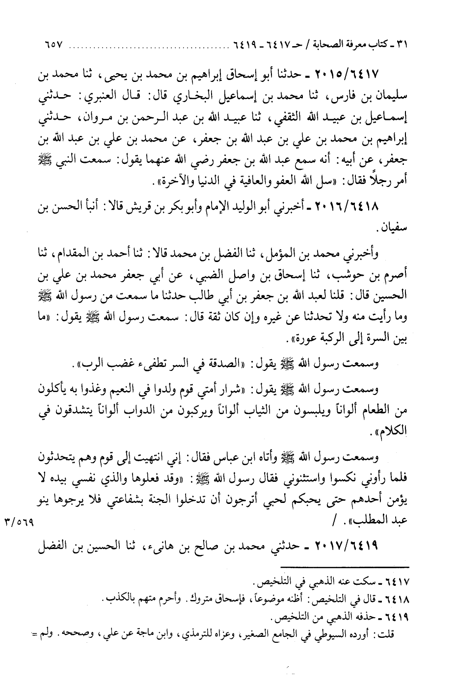 6417 - حَدَّثَنَا أَبُو إِسْحَاقَ إِبْرَاهِيمُ بْنُ مُحَمَّدِ بْنِ يَحْيَى، ثَنَا مُحَمَّدُ بْنُ سُلَيْمَانَ بْنِ فَارِسٍ، ثَنَا مُحَمَّدُ بْنُ إِسْمَاعِيلَ الْبُخَارِيُّ، قَالَ: قَالَ الْعَنْبَرِيُّ: حَدَّثَنِي إِسْمَاعِيلُ بْنُ عُبَيْدِ اللَّهِ الثَّقَفِيُّ، ثَنَا عُبَيْدُ اللَّهِ بْنُ عَبْدِ الرَّحْمَنِ بْنِ مَرْوَانَ، حَدَّثَنِي إِبْرَاهِيمُ بْنُ مُحَمَّدِ بْنِ عَلِيِّ بْنِ عَبْدِ اللَّهِ بْنِ جَعْفَرٍ، عَنْ مُحَمَّدِ بْنِ عَلِيِّ بْنِ عَبْدِ اللَّهِ بْنِ جَعْفَرٍ، عَنْ أَبِيهِ، أَنَّهُ سَمِعَ عَبْدَ اللَّهِ بْنَ جَعْفَرٍ رَضِيَ اللَّهُ عَنْهُمَا، يَقُولُ: سَمِعْتُ النَّبِيَّ صَلَّى اللهُ عَلَيْهِ وَسَلَّمَ أَمَرَ رَجُلًا فَقَالَ: §«سَلِ اللَّهَ الْعَفْوَ وَالْعَافِيَةَ فِي الدُّنْيَا وَالْآخِرَةَ» K6417 - سكت عنه الذهبي في التلخيص