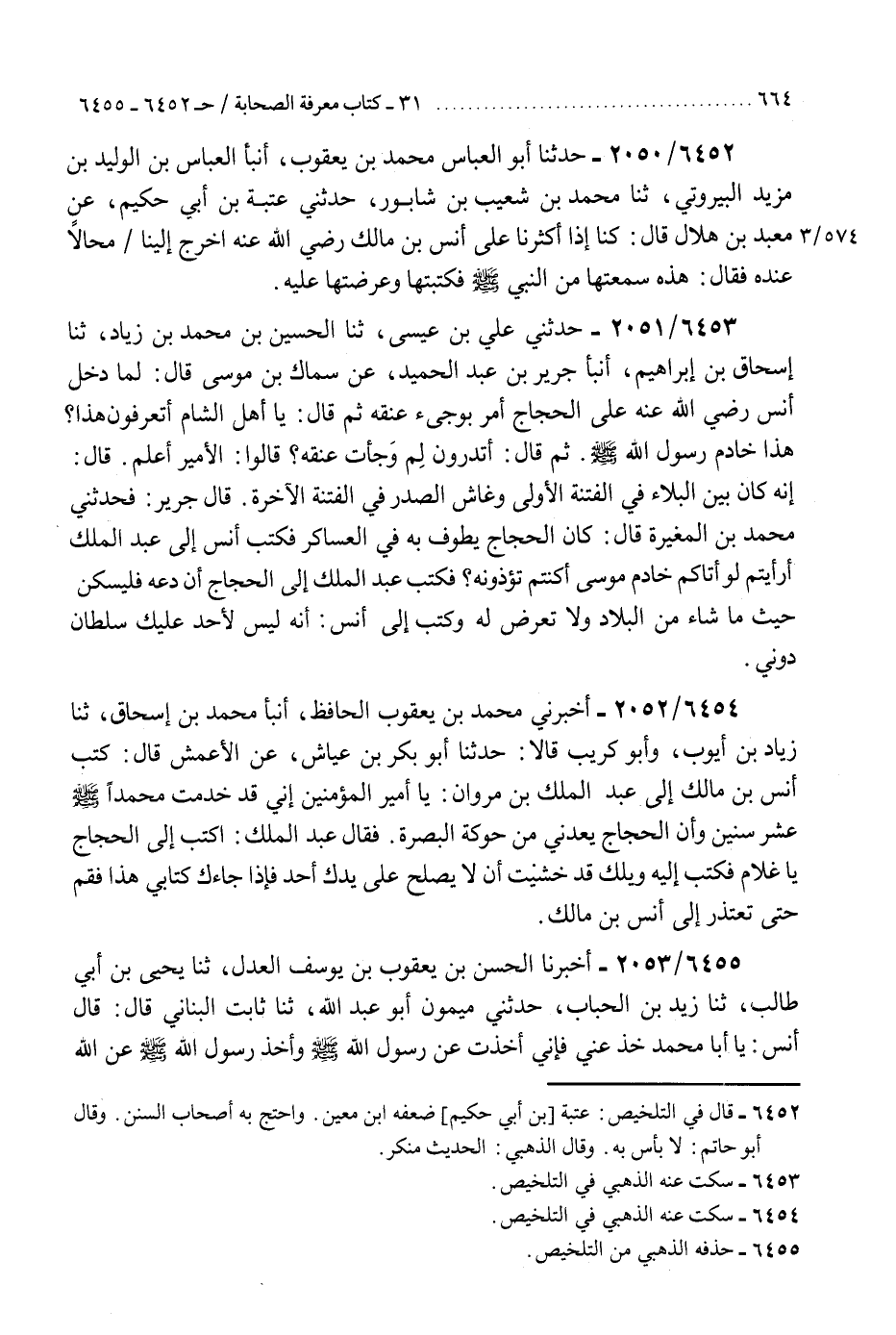 6453 - حَدَّثَنِي عَلِيُّ بْنُ عِيسَى، ثَنَا الْحُسَيْنُ بْنُ مُحَمَّدِ بْنِ زِيَادٍ، ثَنَا إِسْحَاقُ بْنُ إِبْرَاهِيمَ، أَنْبَأَ جَرِيرُ بْنُ عَبْدِ الْحَمِيدِ، عَنْ سِمَاكِ بْنِ مُوسَى، قَالَ: §" لَمَّا دَخَلَ أَنَسٌ رَضِيَ اللَّهُ عَنْهُ عَلَى الْحَجَّاجِ أَمَرَ بِوَجْئِ عُنُقِهِ، ثُمَّ قَالَ: يَا أَهْلَ الشَّامِ، أَتَعْرِفُونَ هَذَا؟ هَذَا خَادِمُ رَسُولِ اللَّهِ صَلَّى اللهُ عَلَيْهِ وَسَلَّمَ، ثُمَّ قَالَ: أَتَدْرُونَ لِمَ وَجَأْتُ عُنُقَهُ؟ قَالُوا: الْأَمِيرُ أَعْلَمُ، قَالَ: إِنَّهُ كَانَ بَيْنَ الْبَلَاءِ فِي الْفِتْنَةِ الْأُولَى، وَغَاشَ الصَّدْرَ فِي الْفِتْنَةِ الْآخِرَةِ "K6453 - سكت عنه الذهبي في التلخيص