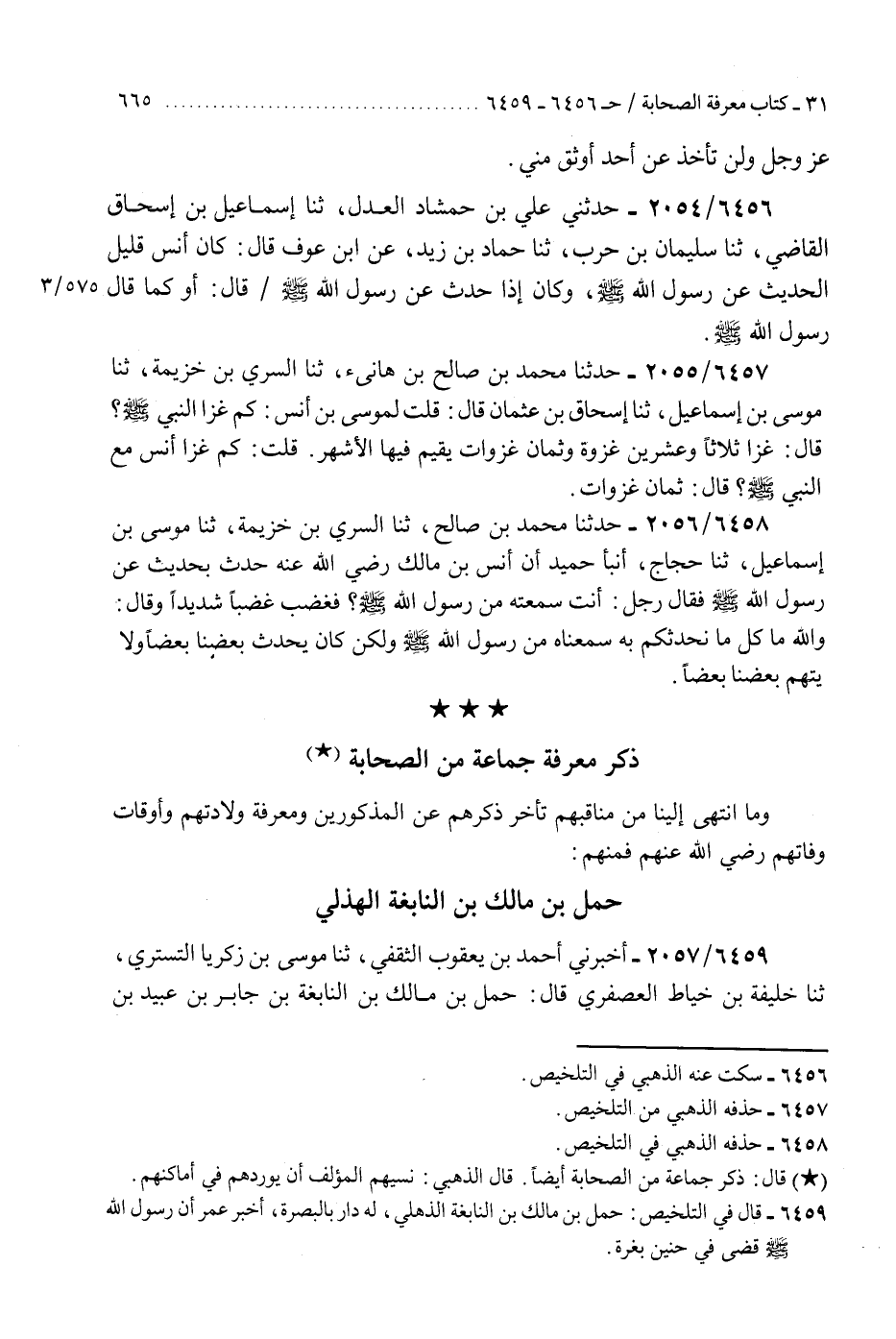 6457 - حَدَّثَنَا مُحَمَّدُ بْنُ صَالِحِ بْنِ هَانِئٍ، ثَنَا السَّرِيُّ بْنُ خُزَيْمَةَ، ثَنَا مُوسَى بْنُ إِسْمَاعِيلَ، ثَنَا إِسْحَاقُ بْنُ عُثْمَانَ، قَالَ: قُلْتُ لِمُوسَى بْنِ أَنَسٍ: كَمْ غَزَا النَّبِيُّ صَلَّى اللهُ عَلَيْهِ وَسَلَّمَ؟ قَالَ: «§غَزَا ثَلَاثًا وَعِشْرِينَ غَزْوَةً، وَثَمَانَ غَزَوَاتٍ يُقِيمُ فِيهَا الْأَشْهُرَ» ، قُلْتُ: كَمْ غَزَا أَنَسٌ مَعَ النَّبِيِّ صَلَّى اللهُ عَلَيْهِ وَسَلَّمَ؟ قَالَ: «ثَمَانَ غَزَوَاتٍ»