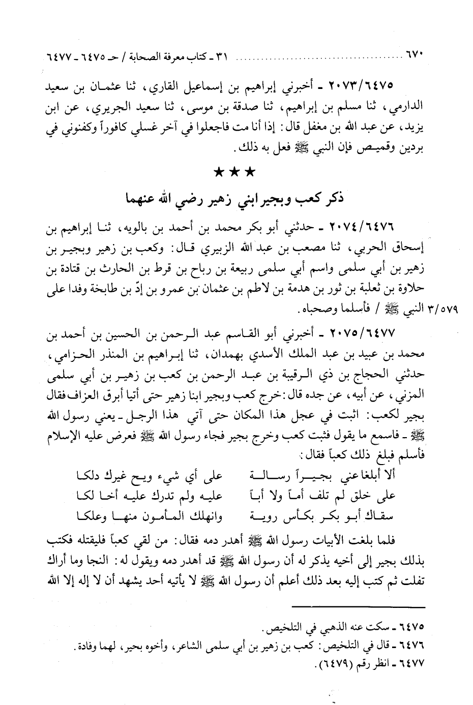 6476 - حَدَّثَنِي أَبُو بَكْرٍ مُحَمَّدُ بْنُ أَحْمَدَ بْنِ بَالَوَيْهِ، ثَنَا إِبْرَاهِيمُ بْنُ إِسْحَاقَ الْحَرْبِيُّ، ثَنَا مُصْعَبُ بْنُ عَبْدِ اللَّهِ الزُّبَيْرِيُّ، قَالَ: §«وَكَعْبُ بْنُ زُهَيْرٍ وَبُجَيْرُ بْنُ زُهَيْرِ بْنِ أَبِي سُلْمَى وَاسْمُ أَبِي سُلْمَى رَبِيعَةُ بْنُ رَبَاحِ بْنِ قُرْطِ بْنِ الْحَارِثِ بْنِ قَتَادَةَ بْنِ حَلَاوَةَ بْنِ ثَعْلَبَةَ بْنِ ثَوْرِ بْنِ هَدْمَةَ بْنِ لَاطِمِ بْنِ عُثْمَانَ بْنِ عَمْرِو بْنِ أَدِّ بْنِ طَابِخَةَ وَفَدَا عَلَى النَّبِيِّ صَلَّى اللهُ عَلَيْهِ وَسَلَّمَ فَأَسْلَمَا وَصَحِبَاهُ»