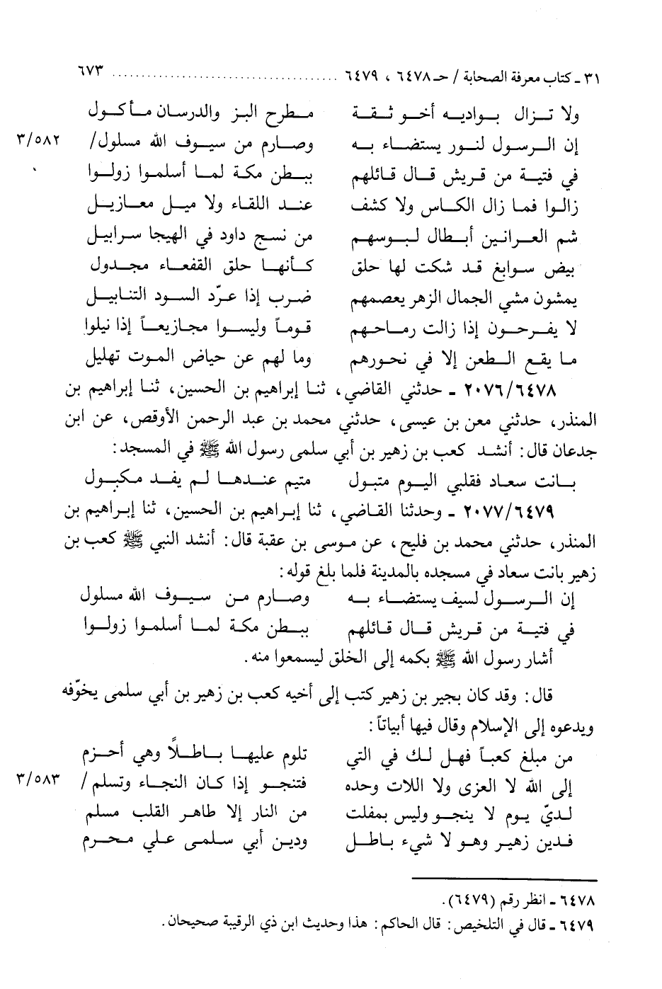 6479 - وَحَدَّثَنَا الْقَاضِي، ثَنَا إِبْرَاهِيمُ بْنُ الْحُسَيْنِ، ثَنَا إِبْرَاهِيمُ بْنُ الْمُنْذِرِ، حَدَّثَنِي مُحَمَّدُ بْنُ فُلَيْحٍ، عَنْ مُوسَى بْنِ عُقْبَةَ، قَالَ: أَنْشَدَ النَّبِيَّ صَلَّى اللهُ عَلَيْهِ وَسَلَّمَ كَعْبُ بْنُ زُهَيْرٍ بَانَتْ سُعَادُ فِي مَسْجِدِهِ بِالْمَدِينَةِ فَلَمَّا بَلَغَ قَوْلَهُ:
