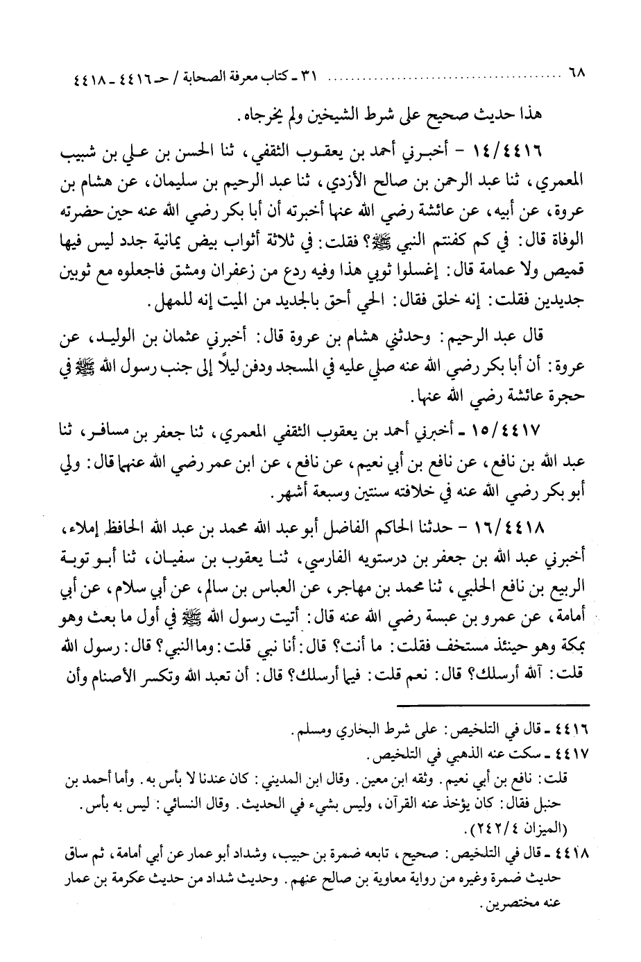 4417 - أَخْبَرَنِي أَحْمَدُ بْنُ يَعْقُوبَ الثَّقَفِيُّ الْمَعْمَرِيُّ، ثنا جَعْفَرُ بْنُ مُسَافِرٍ، ثنا عَبْدُ اللَّهِ بْنُ نَافِعٍ، عَنْ نَافِعِ بْنِ أَبِي نُعَيْمٍ، عَنْ نَافِعٍ، عَنِ ابْنِ عُمَرَ رَضِيَ اللَّهُ عَنْهُمَا قَالَ: §«وَلِيَ أَبُو بَكْرٍ رَضِيَ اللَّهُ عَنْهُ فِي خِلَافَتِهِ سَنَتَيْنِ وَسَبْعَةَ أَشْهُرٍ» K4417 - سكت عنه الذهبي في التلخيص