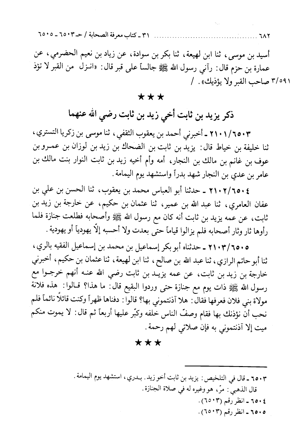 6503 - أَخْبَرَنِي أَحْمَدُ بْنُ يَعْقُوبَ الثَّقَفِيُّ، ثَنَا مُوسَى بْنُ زَكَرِيَّا التُّسْتَرِيُّ، ثَنَا خَلِيفَةُ بْنُ خَيَّاطٍ، قَالَ: §«يَزِيدُ بْنُ ثَابِتِ بْنِ الضَّحَّاكِ بْنِ زَيْدِ بْنِ لَوْزَانَ بْنِ عَمْرِو بْنِ عَوْفِ بْنِ غَانِمِ بْنِ مَالِكِ بْنِ النَّجَّارِ، أُمُّهُ وَأُمُّ أَخِيهِ زَيْدِ بْنِ ثَابِتٍ النَّوَّارُ بِنْتُ مَالِكِ بْنِ عَامِرِ بْنِ عَدِيِّ بْنِ النَّجَّارِ، شَهِدَ بَدْرًا وَاسْتُشْهِدَ يَوْمَ الْيَمَامَةِ»