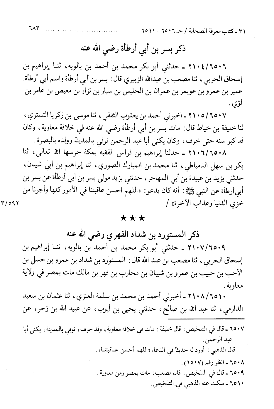 6509 - حَدَّثَنِي أَبُو بَكْرٍ مُحَمَّدُ بْنُ أَحْمَدَ بْنِ بَالَوَيْهِ، ثَنَا إِبْرَاهِيمُ بْنُ إِسْحَاقَ الْحَرْبِيُّ، ثَنَا مُصْعَبُ بْنُ عَبْدِ اللَّهِ، قَالَ: §«الْمُسْتَوْرِدُ بْنُ شَدَّادِ بْنِ عَمْرِو بْنِ حِسْلِ بْنِ الْأَحَبِّ بْنِ حَبِيبِ بْنِ عَمْرِو بْنِ شَيْبَانَ بْنِ مُحَارِبِ بْنِ فِهْرِ بْنِ مَالِكِ مَاتَ بِمِصْرَ فِي وِلَايَةِ مُعَاوِيَةَ»