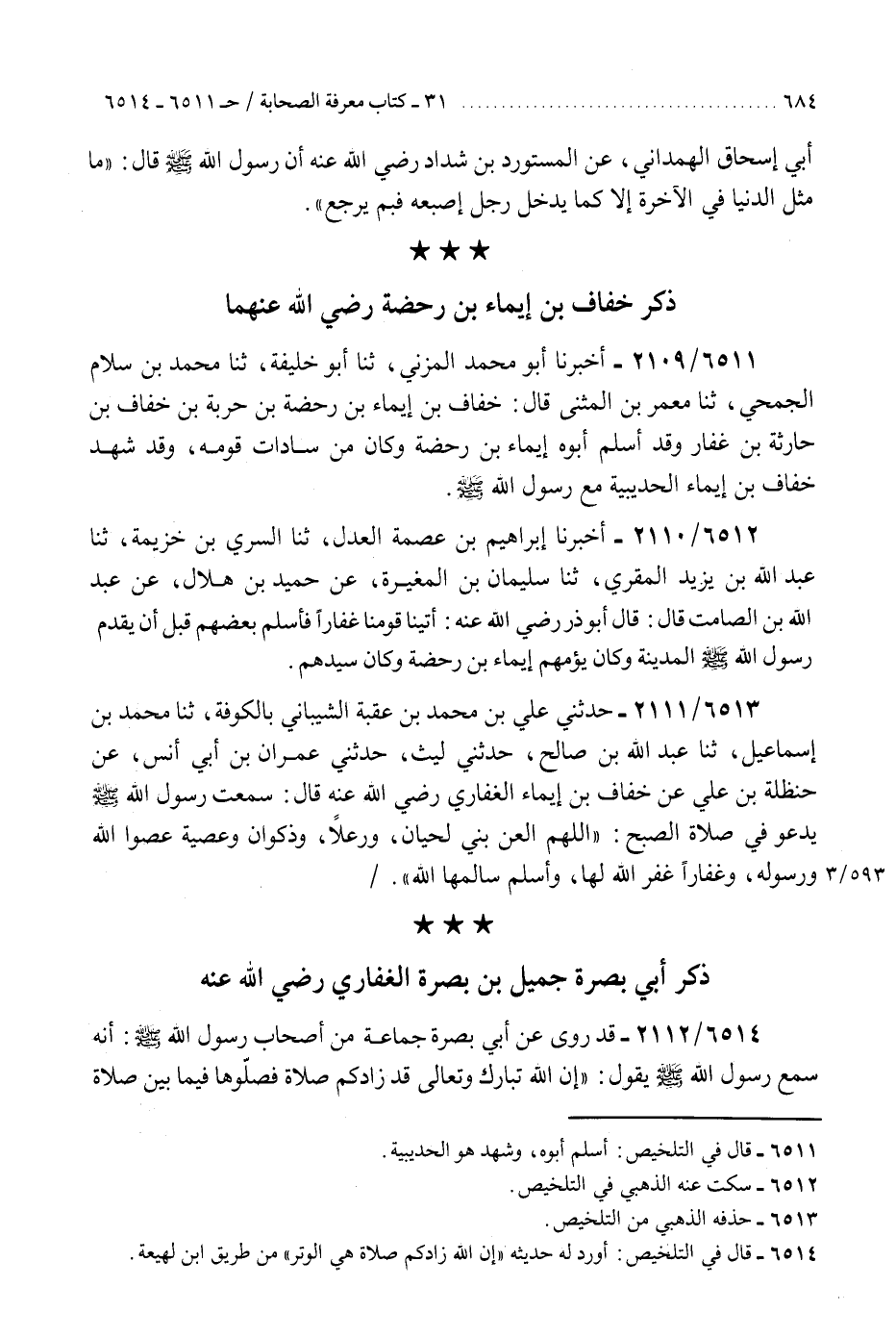 6511 - أَخْبَرَنَا أَبُو مُحَمَّدٍ الْمُزَنِيُّ، ثَنَا أَبُو خَلِيفَةَ، ثَنَا مُحَمَّدُ بْنُ سَلَّامٍ الْجُمَحِيُّ، ثَنَا مَعْمَرُ بْنُ الْمُثَنَّى، قَالَ: §«خُفَافُ بْنُ إِيمَاءَ بْنِ رَحَضَةَ بْنِ حَرْبَةَ بْنِ خُفَافِ بْنِ حَارِثَةَ بْنِ غِفَارٍ، وَقَدْ أَسْلَمَ أَبُوهُ إِيمَاءُ بْنُ رَحَضَةَ وَكَانَ مِنْ سَادَاتِ قَوْمِهِ، وَقَدْ شَهِدَ خُفَافُ بْنُ إِيمَاءَ الْحُدَيْبِيَةَ مَعَ رَسُولِ اللَّهِ صَلَّى اللهُ عَلَيْهِ وَسَلَّمَ.»
