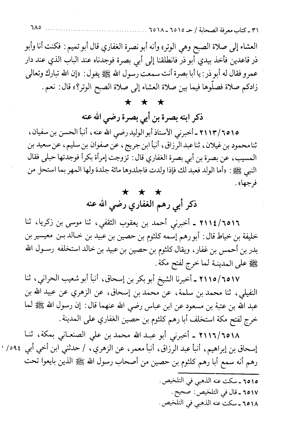 6518 - أَخْبَرَنِي أَبُو عَبْدِ اللَّهِ مُحَمَّدُ بْنُ عَلِيٍّ الصَّنْعَانِيُّ بِمَكَّةَ، ثَنَا إِسْحَاقُ بْنُ إِبْرَاهِيمَ، أَنْبَأَ عَبْدُ الرَّزَّاقِ، أَنْبَأَ مَعْمَرٌ، عَنِ الزُّهْرِيِّ، حَدَّثَنِي ابْنُ أَخِي أَبِي رُهْمٍ، أَنَّهُ سَمِعَ أَبَا رُهْمٍ كُلْثُومَ بْنَ حُصَيْنٍ مِنْ أَصْحَابِ رَسُولِ اللَّهِ صَلَّى اللهُ عَلَيْهِ وَسَلَّمَ الَّذِينَ بَايَعُوا تَحْتَ الشَّجَرَةِ قَالَ: غَزَوْتُ مَعَ رَسُولِ اللَّهِ صَلَّى اللهُ عَلَيْهِ وَسَلَّمَ غَزْوَةَ تَبُوكَ فَسِرْتُ ذَاتَ لَيْلَةٍ مَعَهُ وَنَحْنُ بِقُرْبِ رَسُولِ اللَّهِ صَلَّى اللهُ عَلَيْهِ وَسَلَّمَ وَأَلْقَى عَلَيْنَا النُّعَاسَ وَجَعَلْتُ أَسْتَيْقِظُ وَقَدْ دَنَتْ رَاحِلَتِي مِنْ رَاحِلَةِ رَسُولِ اللَّهِ صَلَّى اللهُ عَلَيْهِ وَسَلَّمَ فَطَفِقْتُ أَزْجُرُ رَاحِلَتِي عَنْهُ حَتَّى غَلَبَتْنِي عَيْنِي فِي بَعْضِ الطَّرِيقِ وَنَحْنُ فِي بَعْضِ اللَّيْلِ، فَقَالَ رَسُولُ اللَّهِ صَلَّى اللهُ عَلَيْهِ وَسَلَّمَ: §«إِنَّ أَعَزَّ أَهْلِي عَلَيَّ أَنْ يَتَخَلَّفَ عَنِّي الْمُهَاجِرُونَ مِنْ قُرَيْشٍ وَالْأَنْصَارُ، وَأَسْلَمُ، وَغِفَارٌ» K6518 - سكت عنه الذهبي في التلخيص