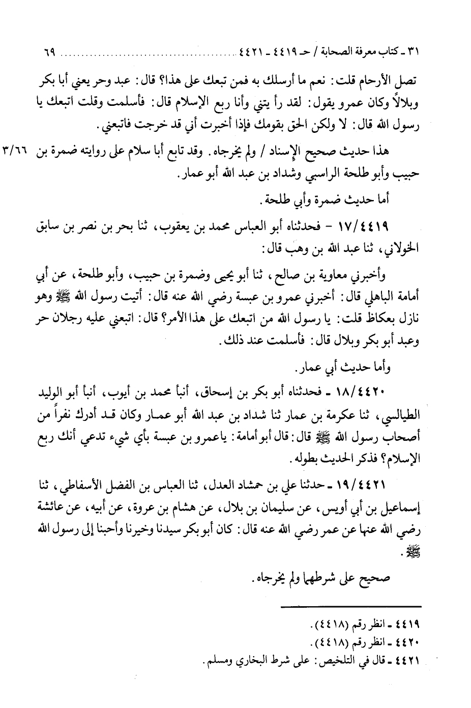 4419 - فَحَدَّثْنَاهُ أَبُو الْعَبَّاسِ مُحَمَّدُ بْنُ يَعْقُوبَ، ثنا بَحْرُ بْنُ نَصْرِ بْنِ سَابِقٍ الْخَوْلَانِيُّ، ثنا عَبْدُ اللَّهِ بْنُ وَهْبٍ، قَالَ: وَأَخْبَرَنِي مُعَاوِيَةُ بْنُ صَالِحٍ، ثنا أَبُو يَحْيَى، وَضَمْرَةُ بْنُ حَبِيبٍ، وَأَبُو طَلْحَةَ، عَنْ أَبِي أُمَامَةَ الْبَاهِلِيِّ قَالَ: أَخْبَرَنِي عَمْرُو بْنُ عَبَسَةَ رَضِيَ اللَّهُ عَنْهُ قَالَ: أَتَيْتُ رَسُولَ اللَّهِ صَلَّى اللهُ عَلَيْهِ وَسَلَّمَ وَهُوَ نَازِلٌ بِعُكَاظٍ قُلْتُ: يَا رَسُولَ اللَّهِ، مَنِ اتَّبَعَكَ عَلَى هَذَا الْأَمْرِ؟ قَالَ: §«اتْبَعْنِي عَلَيْهِ رَجُلَانِ حُرٌّ وَعَبْدٌ أَبُو بَكْرٍ وَبِلَالٌ» قَالَ: فَأَسْلَمْتُ عِنْدَ ذَلِكَ وَأَمَّا حَدِيثُ أَبِي عَمَّارٍ
