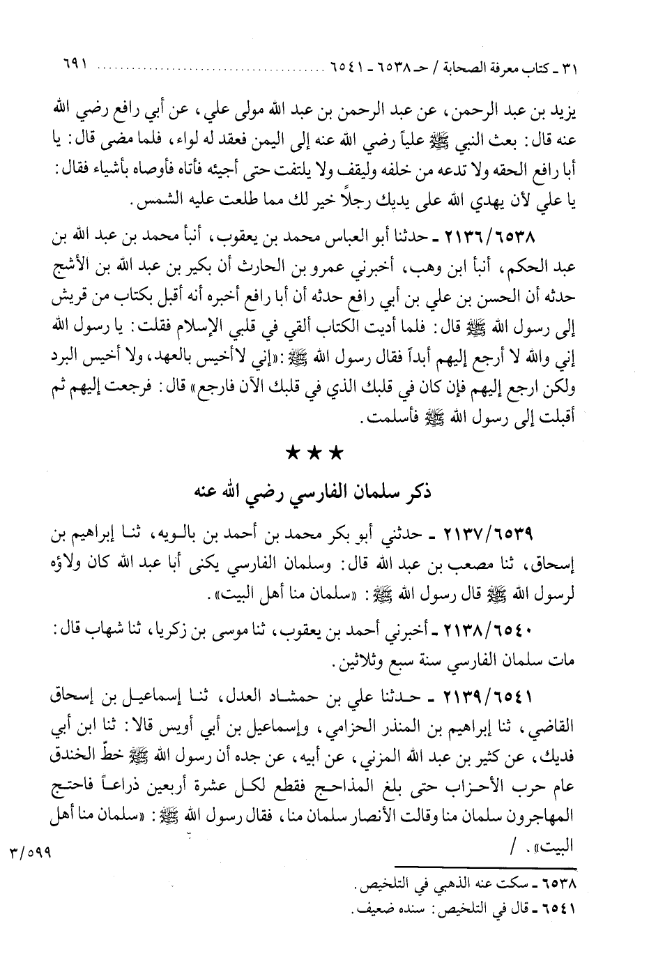 6539 - حَدَّثَنِي أَبُو بَكْرٍ مُحَمَّدُ بْنُ أَحْمَدَ بْنِ بَالَوَيْهِ، ثَنَا إِبْرَاهِيمُ بْنُ إِسْحَاقَ، ثَنَا مُصْعَبُ بْنُ عَبْدِ اللَّهِ، قَالَ: وَسَلْمَانُ الْفَارِسِيُّ يُكَنَّى أَبَا عَبْدِ اللَّهِ كَانَ وَلَاؤُهُ لِرَسُولِ اللَّهِ صَلَّى اللهُ عَلَيْهِ وَسَلَّمَ، قَالَ رَسُولُ اللَّهِ صَلَّى اللهُ عَلَيْهِ وَسَلَّمَ: §«سَلْمَانُ مِنَّا أَهْلَ الْبَيْتِ»