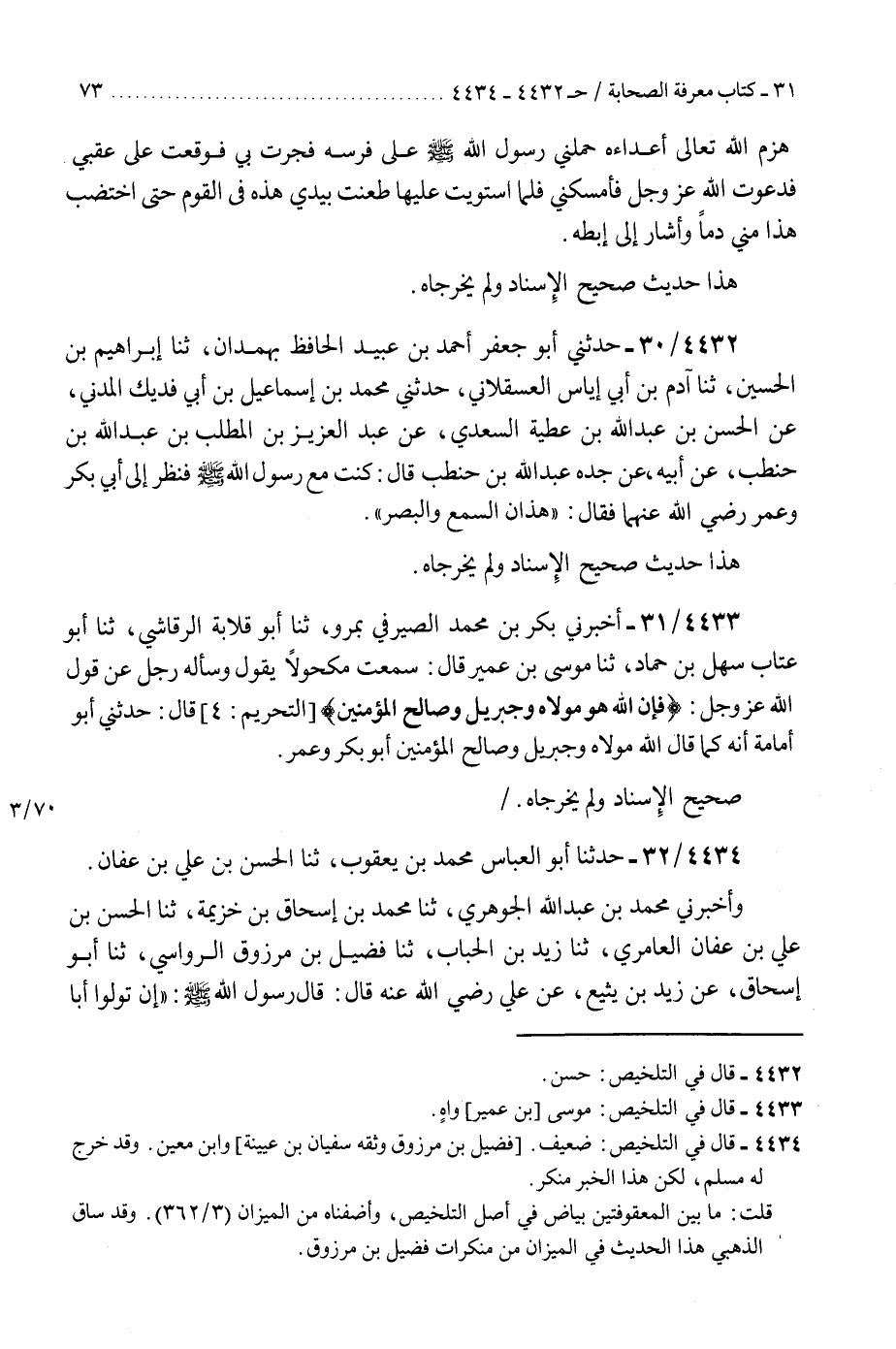 4434 - حَدَّثَنَا أَبُو الْعَبَّاسِ مُحَمَّدُ بْنُ يَعْقُوبَ، ثنا الْحَسَنُ بْنُ عَلِيِّ بْنِ عَفَّانَ، وَأَخْبَرَنِي مُحَمَّدُ بْنُ عَبْدِ اللَّهِ الْجَوْهَرِيُّ، ثنا مُحَمَّدُ بْنُ إِسْحَاقَ بْنِ خُزَيْمَةَ، ثنا الْحَسَنُ بْنُ عَلِيِّ بْنِ عَفَّانَ الْعَامِرِيُّ، ثنا زَيْدُ بْنُ الْحُبَابِ، ثنا فُضَيْلُ بْنُ مَرْزُوقٍ الرُّوَاسِيُّ، ثنا أَبُو إِسْحَاقَ، عَنْ زَيْدِ بْنِ يُثَيْعٍ، عَنْ عَلِيٍّ رَضِيَ اللَّهُ عَنْهُ قَالَ: قَالَ رَسُولُ اللَّهِ صَلَّى اللهُ عَلَيْهِ وَسَلَّمَ: «§إِنْ تُوَلُّوا أَبَا بَكْرٍ تَجِدُوهُ زَاهِدًا فِي الدُّنْيَا، رَاغِبًا فِي الْآخِرَةِ، وَإِنْ تُوَلُّوا عُمَرَ تَجِدُوهُ قَوِيًّا أَمِينًا، لَا تَأْخُذُهُ فِي اللَّهِ تَعَالَى لَوْمَةُ لَائِمٍ، وَإِنْ تُوَلُّوا عَلِيًّا تَجِدُوهُ هَادِيًا مَهْدِيًّا يَسْلُكُ بِكُمُ الطَّرِيقَ» هَذَا حَدِيثٌ صَحِيحُ الْإِسْنَادِ، وَلَمْ يُخَرِّجَاهُ " وَشَاهِدَهُ حَدِيثُ حُذَيْفَةَ بْنِ الْيَمَانِK4434 - ضعيف