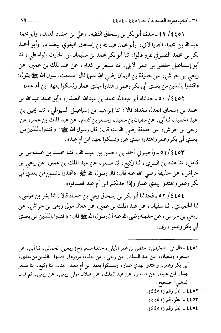 4452 - حَدَّثَنَاهُ أَبُو عَبْدِ اللَّهِ مُحَمَّدُ بْنُ عَبْدِ اللَّهِ الصَّفَّارُ، وَأَبُو مُحَمَّدٍ عَبْدُ اللَّهِ بْنُ مُحَمَّدِ بْنِ إِسْحَاقَ، الْعَدْلُ، بِبَغْدَادَ، قَالَا: ثنا إِبْرَاهِيمُ بْنُ إِسْمَاعِيلَ السِّيُوطِيُّ، ثنا يَحْيَى بْنُ عَبْدِ الْحَمِيدِ، ثنا أَبِي، عَنْ سُفْيَانَ بْنِ سَعِيدٍ، وَمِسْعَرِ بْنِ كِدَامٍ، عَنْ عَبْدِ الْمَلِكِ بْنِ عُمَيْرٍ، عَنْ رِبْعِيِّ بْنِ حِرَاشٍ، عَنْ حُذَيْفَةَ رَضِيَ اللَّهُ عَنْهُ قَالَ: قَالَ رَسُولُ اللَّهِ صَلَّى اللهُ عَلَيْهِ وَسَلَّمَ: «§اقْتَدُوا بِاللَّذَيْنِ مِنْ بَعْدِي أَبِي بَكْرٍ وَعُمَرَ، وَاهْتَدُوا بِهَدْيِ عَمَّارٍ، وَتَمَسَّكُوا بِعَهْدِ ابْنِ أُمِّ عَبْدٍ»