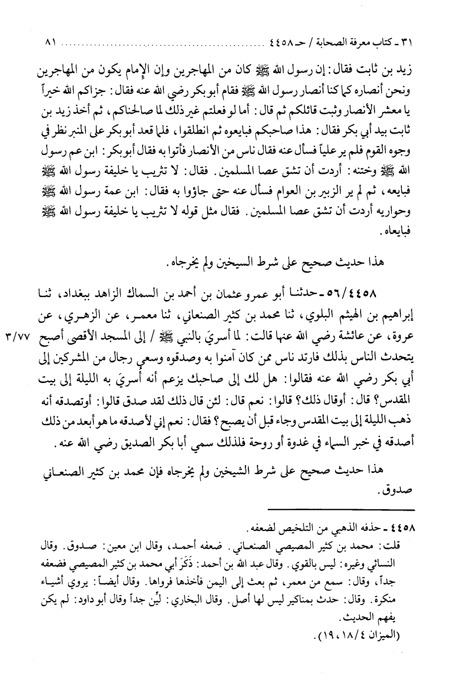 4458 - حَدَّثَنَا أَبُو عَمْرِو عُثْمَانُ بْنُ أَحْمَدَ بْنِ السَّمَّاكِ الزَّاهِدُ، بِبَغْدَادَ ثنا إِبْرَاهِيمُ بْنُ الْهَيْثَمُ الْبَلَوِيِّ، ثنا مُحَمَّدُ بْنُ كَثِيرٍ الصَّنْعَانِيُّ، ثنا مَعْمَرُ، عَنِ الزُّهْرِيِّ، عَنْ عُرْوَةَ، عَنْ عَائِشَةَ رَضِيَ اللَّهُ عَنْهَا قَالَتْ: §" لَمَّا أُسْرِيَ بِالنَّبِيِّ صَلَّى اللهُ عَلَيْهِ وَسَلَّمَ إِلَى الْمَسْجِدِ الْأَقْصَى أَصْبَحَ يَتَحَدَّثُ النَّاسُ بِذَلِكَ، فَارْتَدَّ نَاسٌ مِمَّنْ كَانَ آمَنُوا بِهِ وَصَدَّقُوهُ، وَسَعَى رِجَالٌ مِنَ الْمُشْرِكِينَ إِلَى أَبِي بَكْرٍ رَضِيَ اللَّهُ عَنْهُ، فَقَالُوا: هَلْ لَكَ إِلَى صَاحِبِكِ يَزْعُمُ أَنَّهُ أُسْرِيَ بِهِ اللَّيْلَةَ إِلَى بَيْتِ الْمَقْدِسِ؟ قَالَ: أَوَقَالَ ذَلِكَ؟ قَالُوا: نَعَمْ، قَالَ: لَئِنْ قَالَ ذَلِكَ لَقَدْ صَدَقَ، قَالُوا: أَوَ تُصَدِّقُهُ أَنَّهُ ذَهَبَ اللَّيْلَةَ إِلَى بَيْتِ الْمَقْدِسِ وَجَاءَ قَبْلَ أَنْ يُصْبِحَ؟ فَقَالَ: نَعَمْ، إِنِّي لَأَصُدِّقُهُ فِي مَا هُوَ أَبْعَدُ مِنْ ذَلِكَ أُصَدِّقُهُ فِي خَبَرِ السَّمَاءِ فِي غُدْوَةٍ أَوْ رَوْحَةٍ، فَلِذَلِكَ سُمِّيَ أَبَا بَكْرٍ الصِّدِّيقَ رَضِيَ اللَّهُ عَنْهُ «هَذَا حَدِيثٌ صَحِيحٌ عَلَى شَرْطِ الشَّيْخَيْنِ، وَلَمْ يُخَرِّجَاهُ» ، «فَإِنَّ مُحَمَّدَ بْنَ كَثِيرٍ الصَّنْعَانِيَّ صَدُوقٌ» K4458 - حذفه الذهبي من التلخيص لضعفه