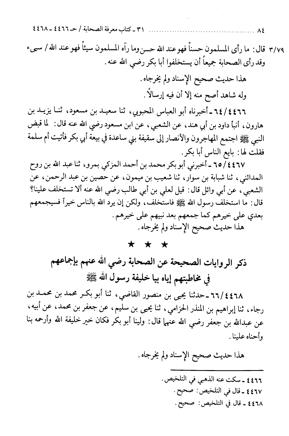 4466 - أَخْبَرْنَاهُ أَبُو الْعَبَّاسِ الْمَحْبُوبِيُّ، ثنا سَعِيدُ بْنُ مَسْعُودٍ، ثنا يَزِيدُ بْنُ هَارُونَ، أَنْبَأَ دَاوُدُ بْنُ أَبِي هِنْدٍ، عَنِ الشَّعْبِيِّ، عَنِ ابْنِ مَسْعُودٍ رَضِيَ اللَّهُ عَنْهُ قَالَ: §" لَمَّا قُبِضَ النَّبِيُّ صَلَّى اللهُ عَلَيْهِ وَسَلَّمَ اجْتَمَعَ الْمُهَاجِرُونَ وَالْأَنْصَارُ إِلَى سَقِيفَةِ بَنِي سَاعِدَةَ فِي بَيْعَةِ أَبِي بَكْرٍ، فَأَتَيْتُ أُمَّ سَلَمَةَ، فَقُلْتُ: لَهَا بَايَعَ النَّاسُ أَبَا بَكْرٍ "K4466 - سكت عنه الذهبي في التلخيص
