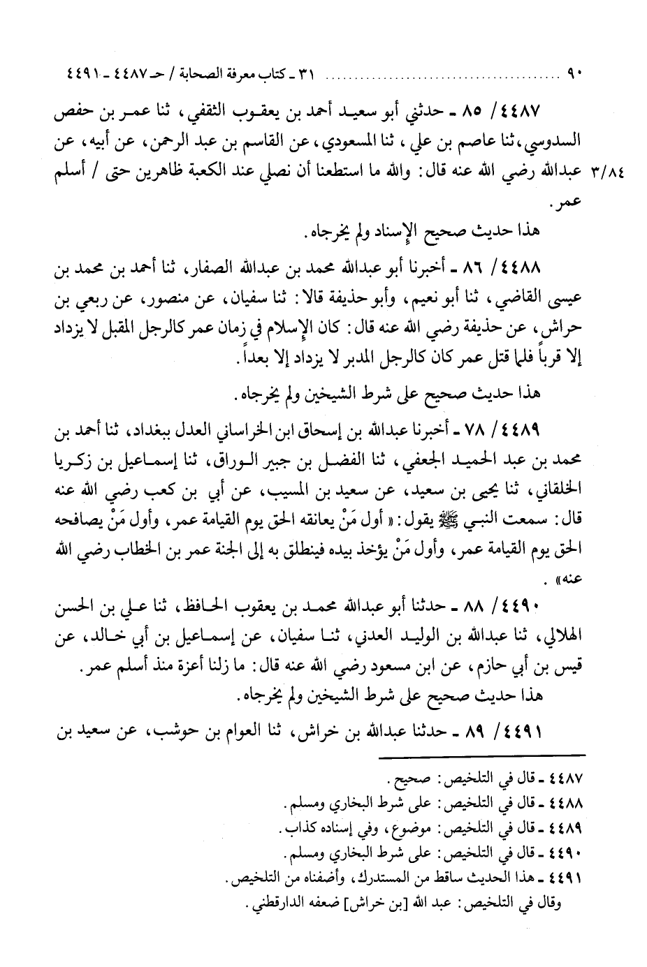 4490 - حَدَّثَنَا أَبُو عَبْدِ اللَّهِ مُحَمَّدُ بْنُ يَعْقُوبَ الْحَافِظُ، ثنا عَلِيُّ بْنُ الْحَسَنِ الْهِلَالِيُّ، ثنا عَبْدُ اللَّهِ بْنُ الْوَلِيدِ الْعَدَنِيُّ، ثنا سُفْيَانُ، عَنْ إِسْمَاعِيلَ بْنِ أَبِي خَالِدٍ، عَنْ قَيْسِ بْنِ أَبِي حَازِمٍ، عَنِ ابْنِ مَسْعُودٍ رَضِيَ اللَّهُ عَنْهُ قَالَ: §«مَا زِلْنَا أَعِزَّةً مُنْذُ أَسْلَمَ عُمَرُ» هَذَا حَدِيثٌ صَحِيحٌ عَلَى شَرْطِ الشَّيْخَيْنِ، وَلَمْ يُخَرِّجَاهُ "K4490 - على شرط البخاري ومسلم