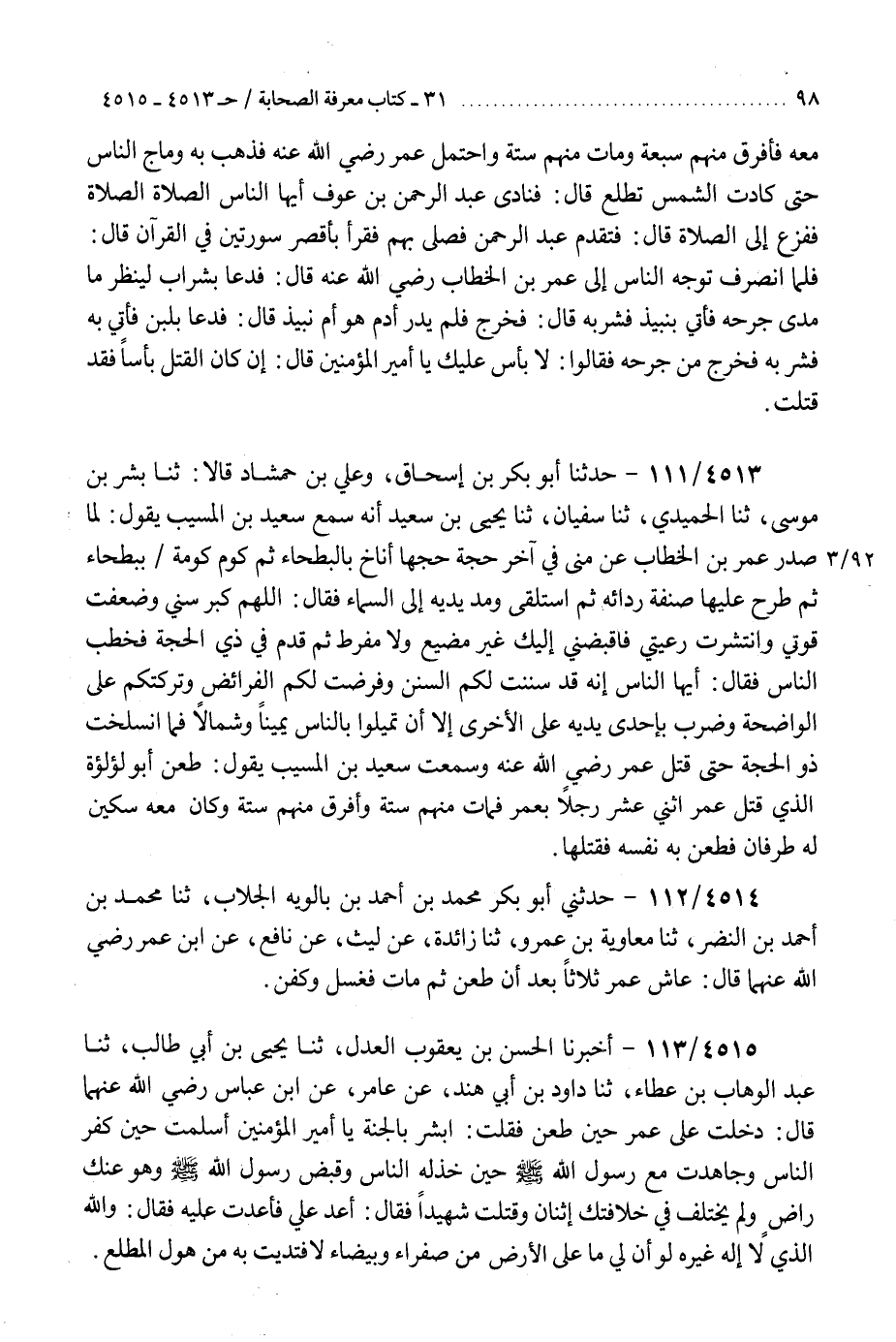 4513 - حَدَّثَنَا أَبُو بَكْرِ بْنُ إِسْحَاقَ، وَعَلِيُّ بْنُ حَمْشَاذٍ، قَالَا: ثنا بِشْرُ بْنُ مُوسَى، ثنا الْحُمَيْدِيُّ، ثنا سُفْيَانُ، ثنا يَحْيَى بْنُ سَعِيدٍ، أَنَّهُ سَمِعَ سَعِيدَ بْنَ الْمُسَيِّبِ يَقُولُ: لَمَّا صَدَرَ عُمَرُ بْنُ الْخَطَّابِ عَنْ مِنًى فِي آخِرِ حَجَّةٍ أَنَاخَ بِالْبَطْحَاءِ، ثُمَّ كَوَّمَ كَوْمَةً بِبَطْحَاءَ، ثُمَّ طَرَحَ عَلَيْهَا صِنْفَةَ رِدَائِهِ، ثُمَّ اسْتَلْقَى وَمَدَّ يَدَيْهِ إِلَى السَّمَاءِ، فَقَالَ: «§اللَّهُمَّ كَبُرَ سِنِّي، وَضَعُفَتْ قُوَّتِي، وَانْتَشَرَتْ رَعِيَّتِي، فَاقْبِضْنِي إِلَيْكَ غَيْرَ مُضَيِّعٍ وَلَا مُفَرِّطٍ» ، ثُمَّ قَدِمَ فِي ذِي الْحِجَّةِ فَخَطَبَ النَّاسَ، فَقَالَ: «أَيُّهَا النَّاسُ، إِنَّهُ قَدْ سَنَنْتُ لَكُمُ السُّنَنَ، وَفُرِضْتُ لَكُمُ الْفَرَائِضَ، وَتَرَكْتُكُمْ عَلَى الْوَاضِحَةِ - وَضَرَبَ بِإِحْدَى يَدَيْهِ عَلَى الْأُخْرَى - إِلَّا أَنْ تَمِيلُوا بِالنَّاسِ يَمِينًا وَشِمَالًا» ، فَمَا انْسَلَخْتَ ذُو الْحِجَّةِ حَتَّى قُتِلَ عُمَرُ رَضِيَ اللَّهُ عَنْهُ، وَسَمِعْتُ سَعِيدَ بْنَ الْمُسَيِّبِ يَقُولُ: «طَعَنَ أَبُو لُؤْلُؤَةَ الَّذِي قَتَلَ عُمَرَ اثْنَيْ عَشَرَ رَجُلًا بِعُمَرَ فَمَاتَ مِنْهُمْ سِتَّةٌ، وَأُفْرِقَ مِنْهُمْ سِتَّةٌ، وَكَانَ مَعَهُ سِكِّينٌ لَهُ طَرَفَانِ فَطَعَنَ بِهِ نَفْسَهُ فَقَتَلَهَا»