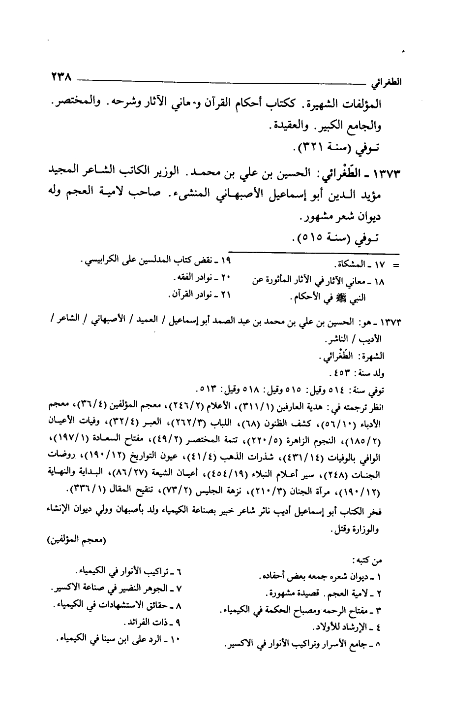 الطَّغْرائي: الحسين بن علي بن محمد. الوزير الكاتب الشاعر المجيد مؤيد الدين أبو إسماعيل الأصبهاني المنشئ. صاحب لامية العجم وله ديوان شعر مشهور. توفي سنة 515.