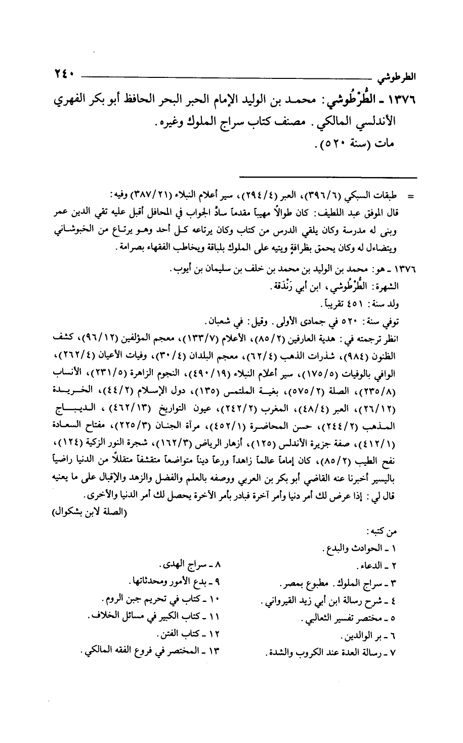 الطُّرْطوشي: محمد بن الوليد الإمام الحبر البحر الحافظ أبو بكر الفهري الأندلسي المالكي. مصنف كتاب سراج الملوك وغيره. مات سنة 520.