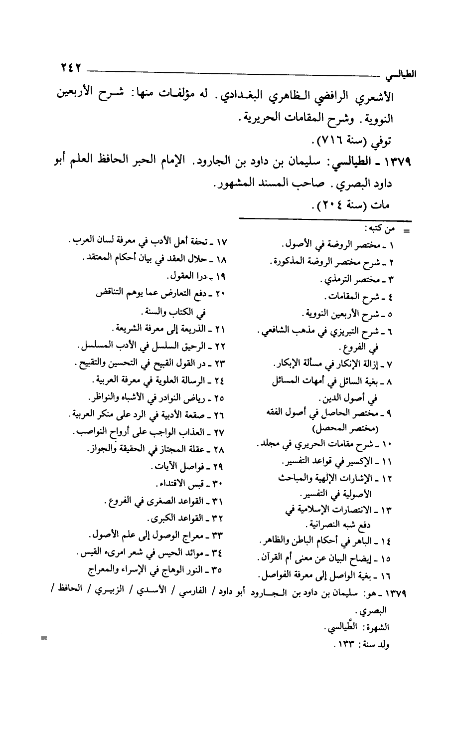 الطيالسي: سليمان بن داود بن الجارود. الإمام الحبر الحافظ العلم أبو داود البصري. صاحب المسند المشهور. مات سنة 204.