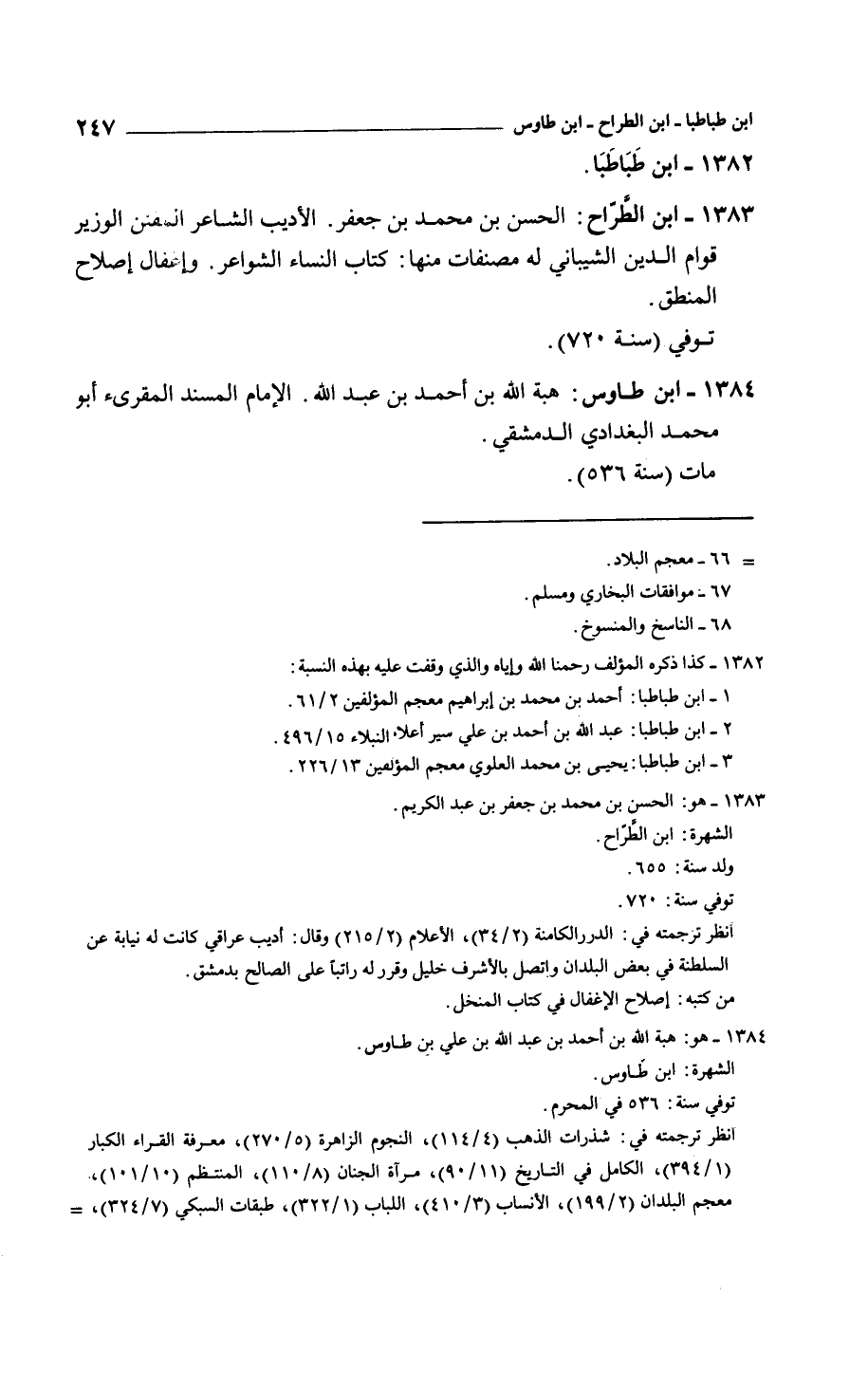 ابن الطَّرَّاح: الحسن بن محمد بن جعفر. الأديب الشاعر المفنن الوزير قوام الدين الشيباني له مصنفات منها: كتاب النساء الشواعر. وإغفال إصلاح المنطق. توفي سنة 720.