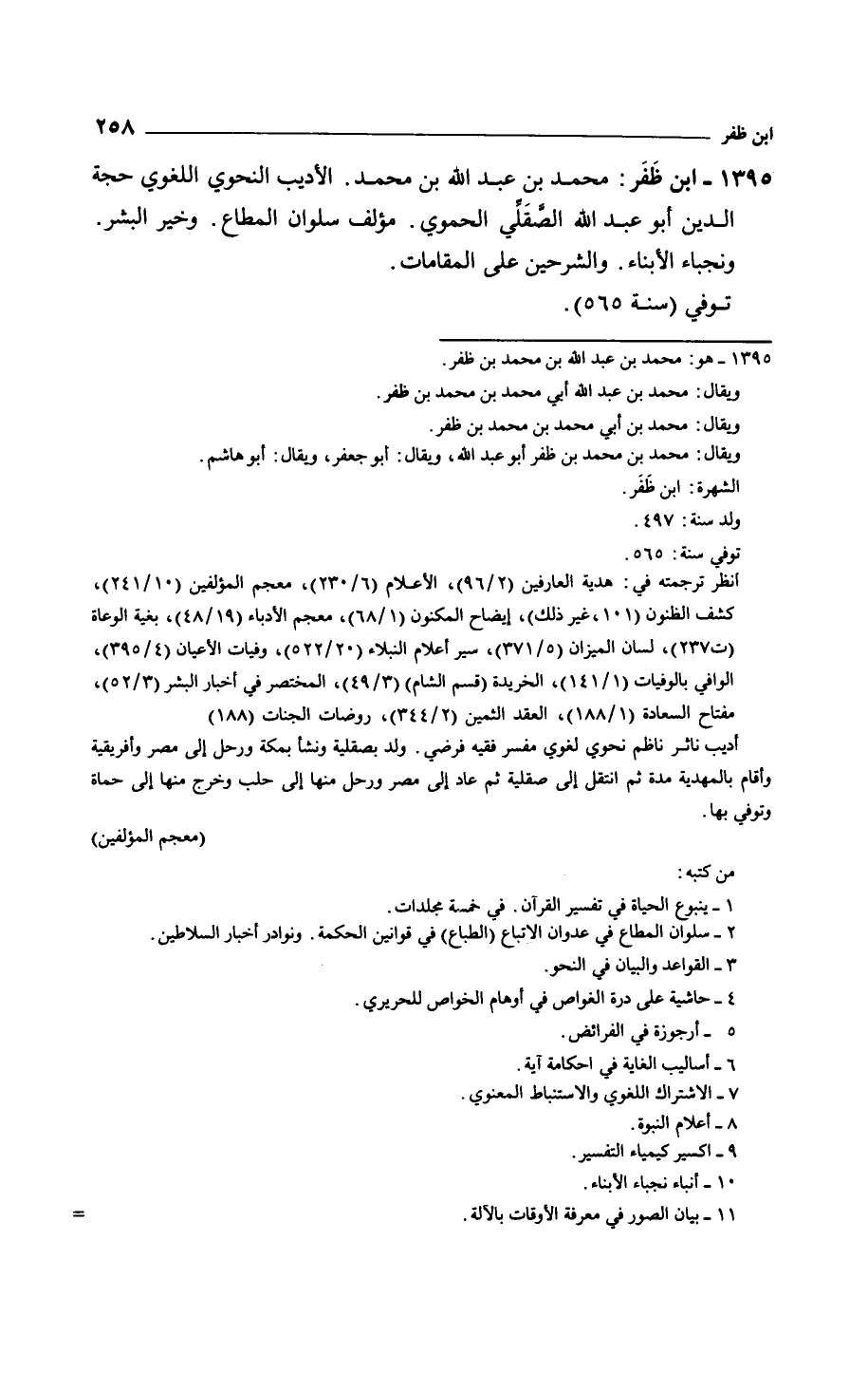 ابن ظَفَر: محمد بن عبد الله بن محمد. الأديب النحوي اللغوي حجة الدين أبو عبد الله الصَّقَلِّي الحموي. مؤلف سلوان المطاع. وخير البشر ونجباء الأبناء. والشرحين على المقامات. توفي سنة 565.