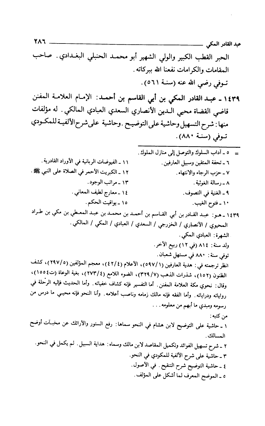 عبد القادر المكي بن أبي القاسم بن أحمد: الإمام العلامة المفنن قاضي القضاة محيي الدين الأنصاري السعدي العبادي المالكي. له مؤلفات منها: شرح التسهيل وحاشية على التوضيح. وحاشية على شرح الألفية للمكودي. توفي سنة 880.