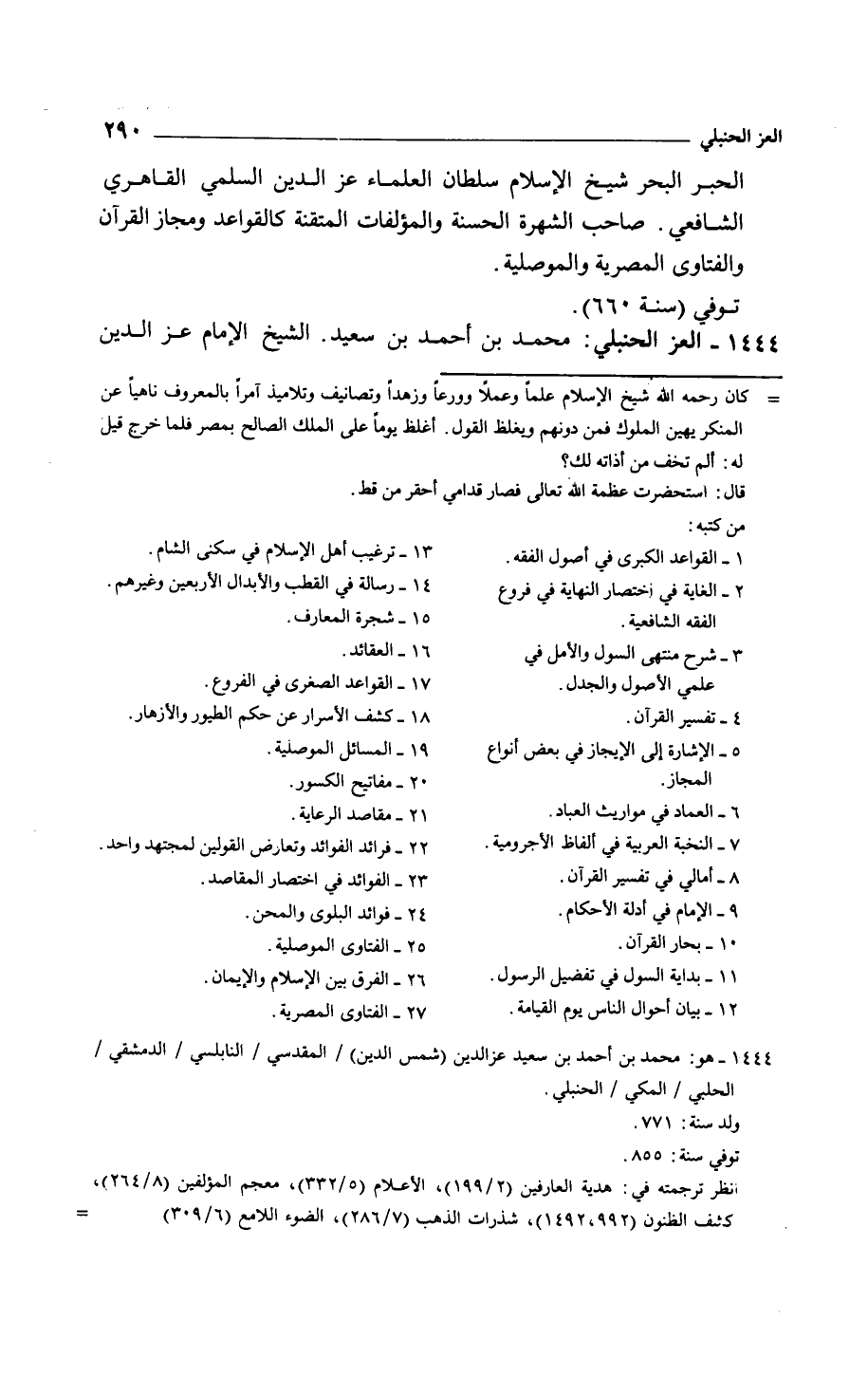 الحبر شيخ الإسلام سلطان العلماء عز الدين السلمي القاهري الشافعي. صاحب الشهرة الحسنة والمؤلفات المتقنة كالقواعد ومجاز القرآن والفتاوى المصرية والموصلية. توفي سنة 660.