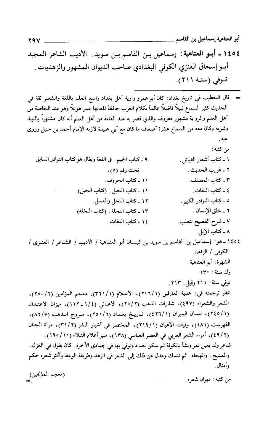 أبو العتاهية: إسماعيل بن القاسم بن سويد. الأديب الشاعر المجيد أبو إسحاق العنزي الكوفي البغدادي صاحب الديوان المشهور والزهديات. توفي سنة 211.