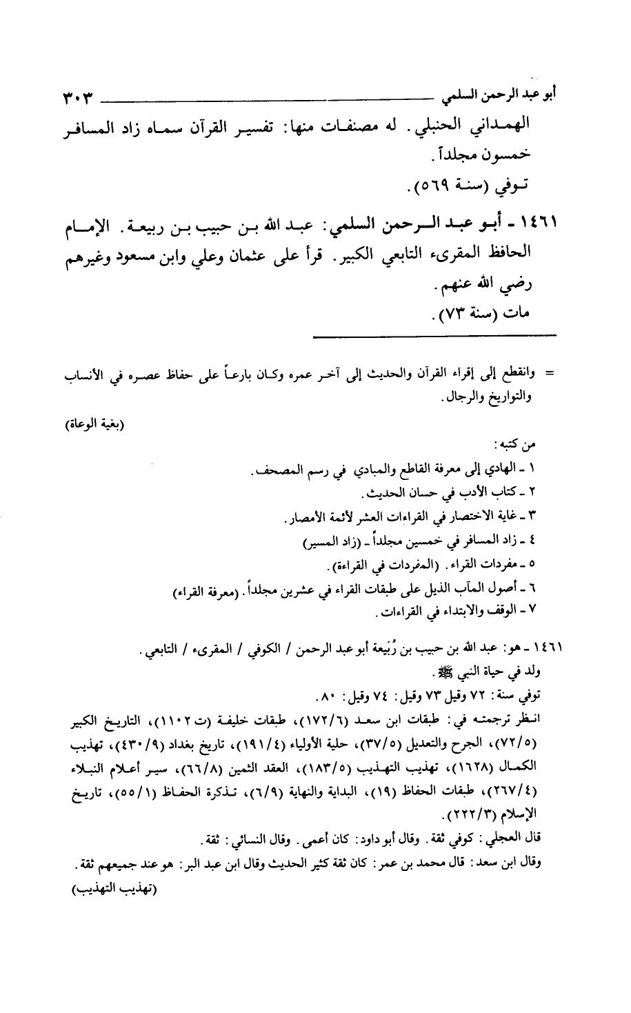 أبو عبد الرحمن السلمي: عبد الله بن حبيب بن ربيعة. الإمام الحافظ المقرئ التابعي الكبير. قرأ على عثمان وعلي وابن مسعود وغيرهم رضي الله عنهم. مات سنة 73.