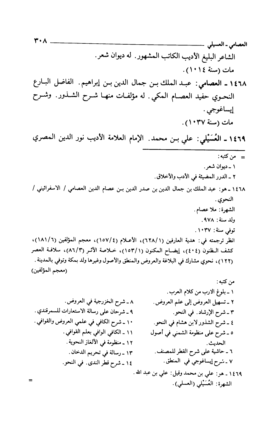 العصامي: عبد الملك بن جمال الدين بن إبراهيم. الفاضل البارع النحوي حفيد العصام المكي. له مؤلفات منها: شرح الشذور. وشرح إيساغوجي. مات سنة 1037.