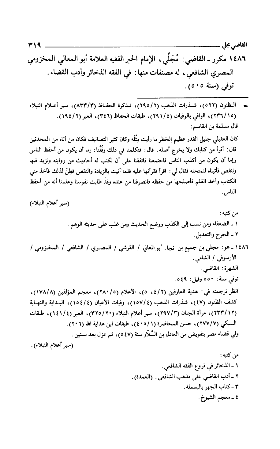 مكرر، القاضي: مُجَلِّي، الإمام الحبر الفقيه العلامة أبو المعالي المخزومي المصري الشافعي، له مصنفات منها: في الفقه الذخائر وأدب القضاء. توفي سنة 505.