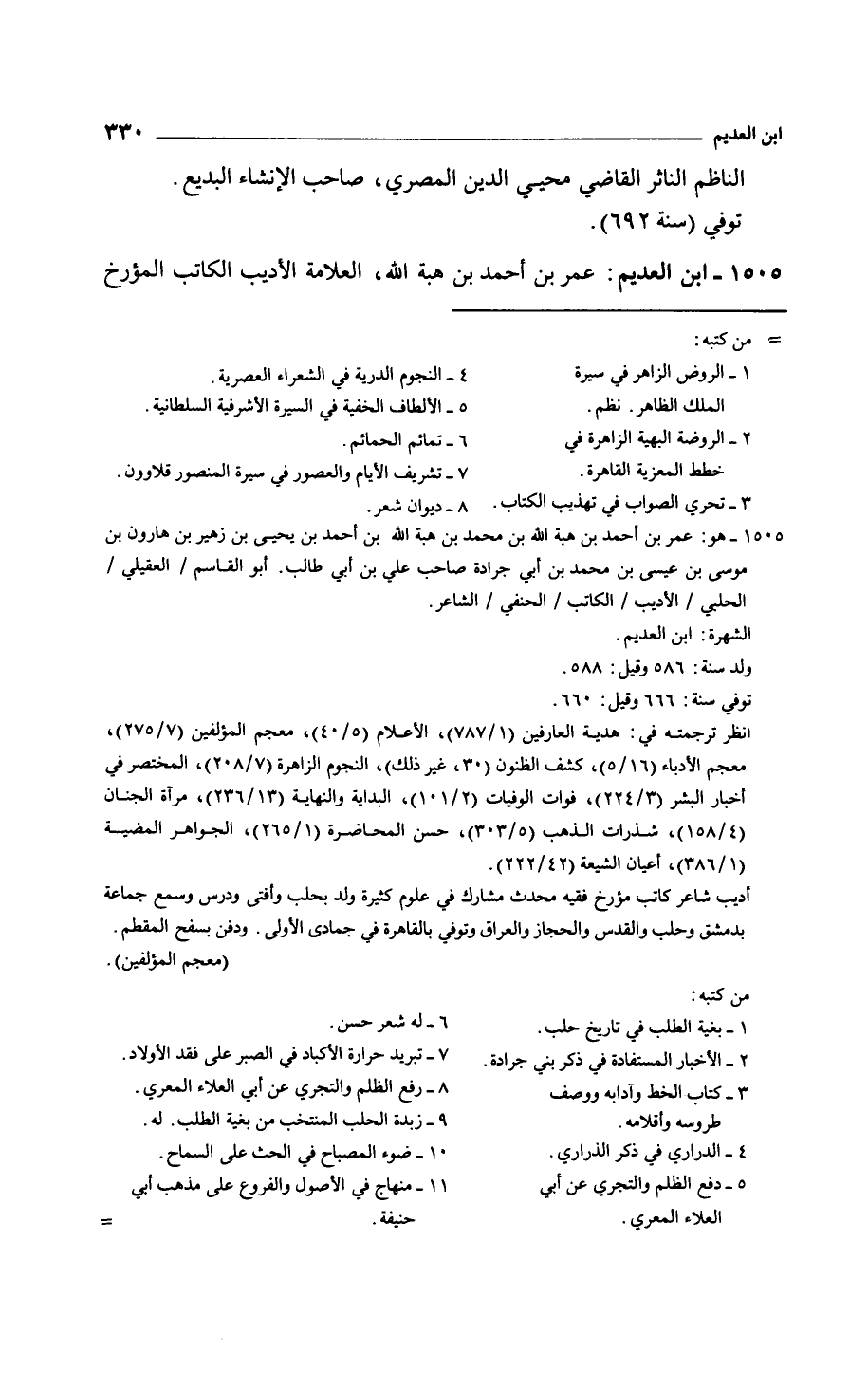 ابن العديم: عمر بن أحمد بن هبة الله، العلامة الأديب الكاتب المؤرخ