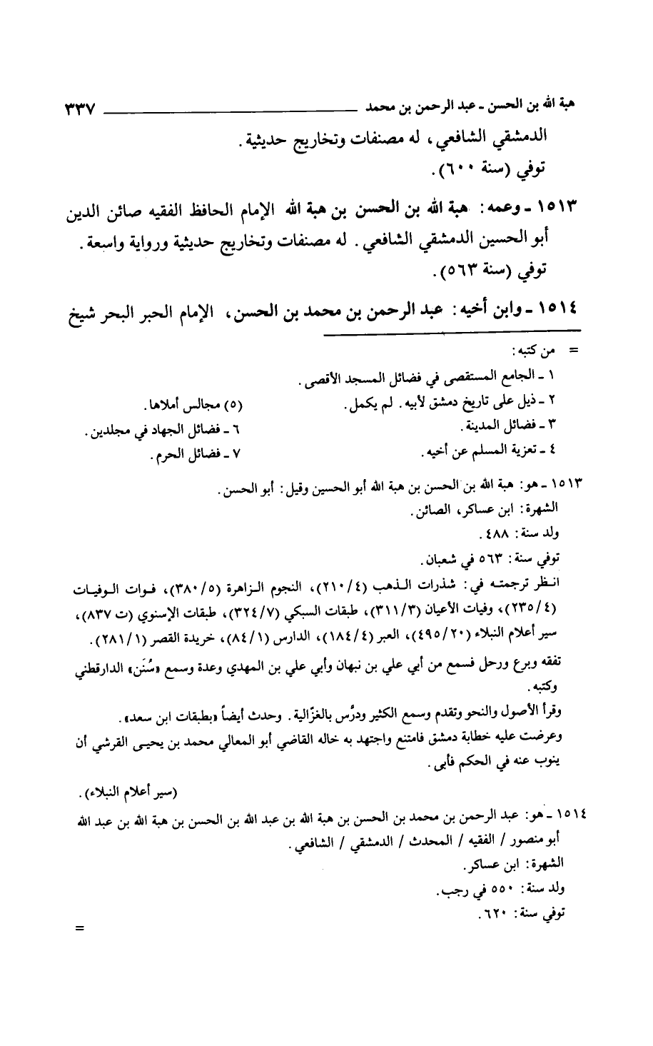 وعمه: هبة الله بن الحسن بن هبة الله الإمام الحافظ الفقيه صائن الدين أبو الحسين الدمشقي الشافعي. له مصنفات وتخاريج حديثية ورواية واسعة. توفي سنة 563.