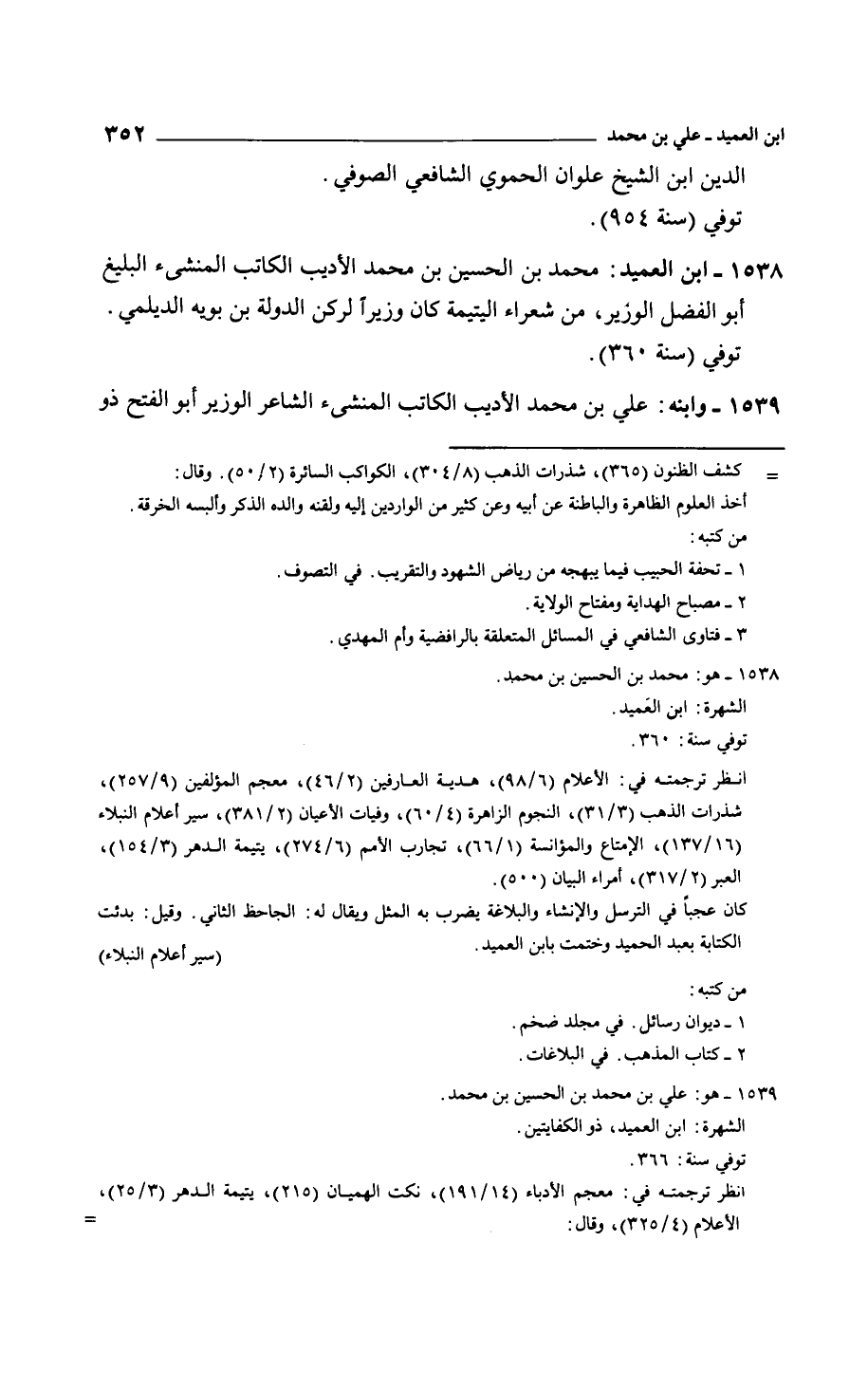 ابن العميد: محمد بن الحسين بن محمد الأديب الكاتب المنشئ البليغ أبو الفضل الوزير، من شعراء اليتيمة كان وزيراً لركن الدولة بن بويه الديلمي. توفي سنة 360.
