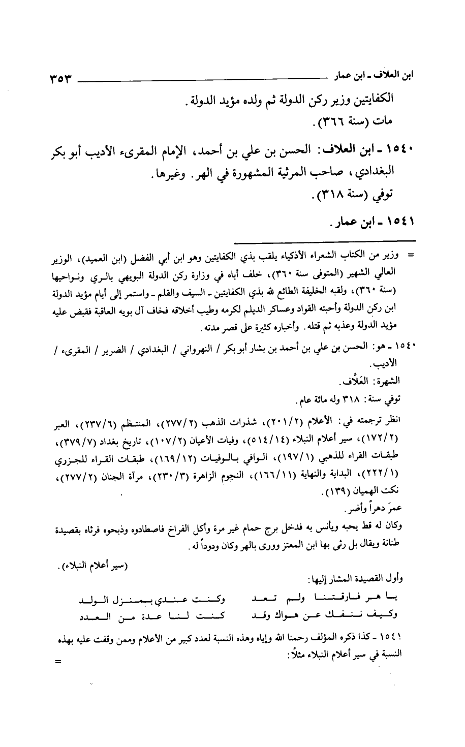 ابن العلاف: الحسن بن علي بن أحمد، الإمام المقرئ الأديب أبو بكر البغدادي، صاحب المرثية المشهورة في الهر. وغيرها. توفي سنة 318.