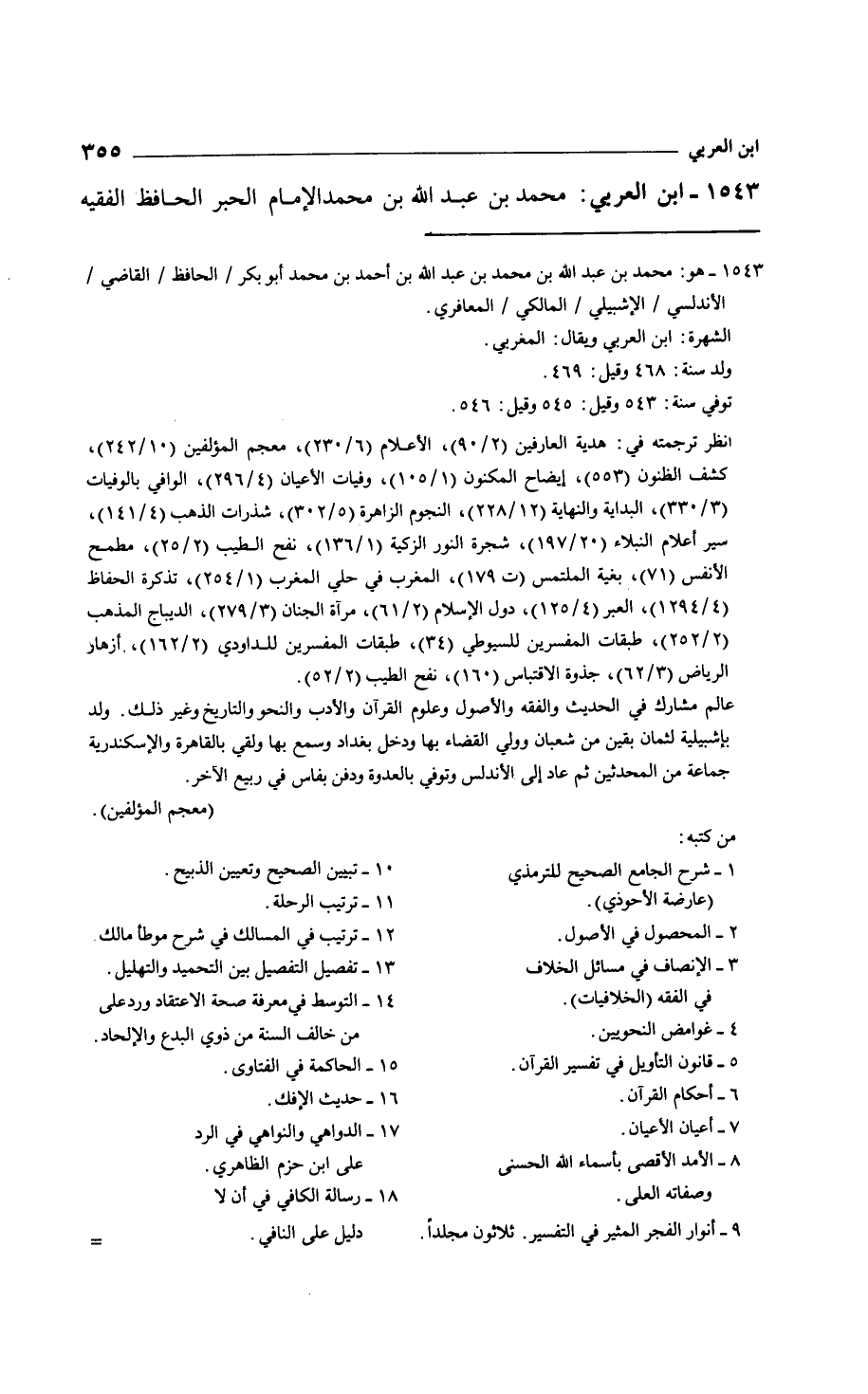 ابن العربي: محمد بن عبد الله بن محمد الإمام الحبر الحافظ الفقيه