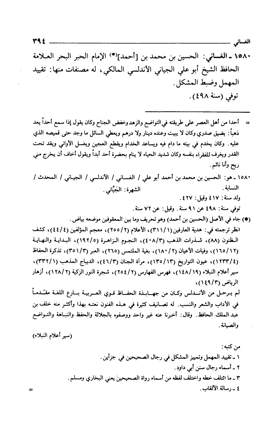 الغساني: الحسين بن محمد بن أحمد، الإمام الحبر البحر العلامة الحافظ الشيخ أبو علي الجياني الأندلسي المالكي، له مصنفات منها: تقييد المهمل وضبط المشكل. توفي سنة 498.