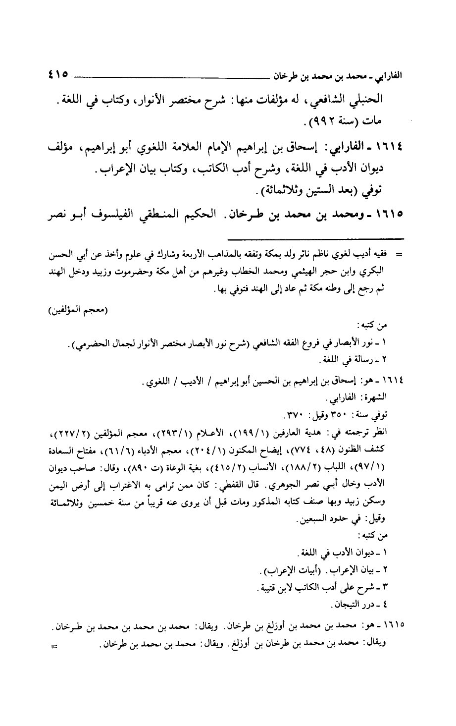 الفارابي: إسحاق بن إبراهيم الإمام العلامة اللغوي أبو إبراهيم، مؤلف ديوان الأدب في اللغة، وشرح أدب الكاتب، وكتاب بيان الإعراب. توفي بعد الستين وثلاثمائة.