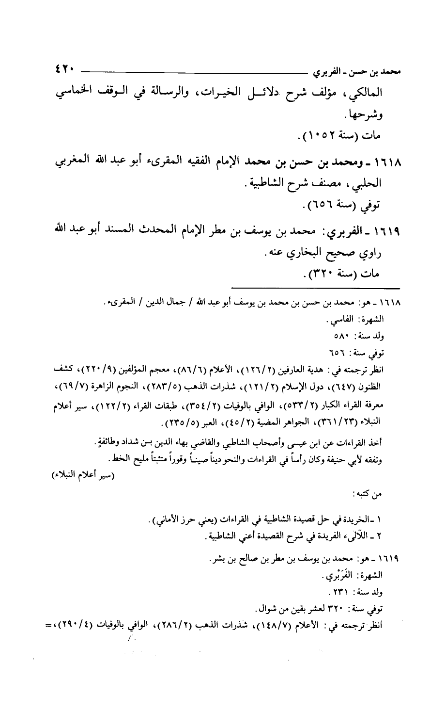 الفربري: محمد بن يوسف بن مطر الإمام المحدث المسند أبو عبد الله راوي صحيح البخاري عنه. مات سنة 320.
