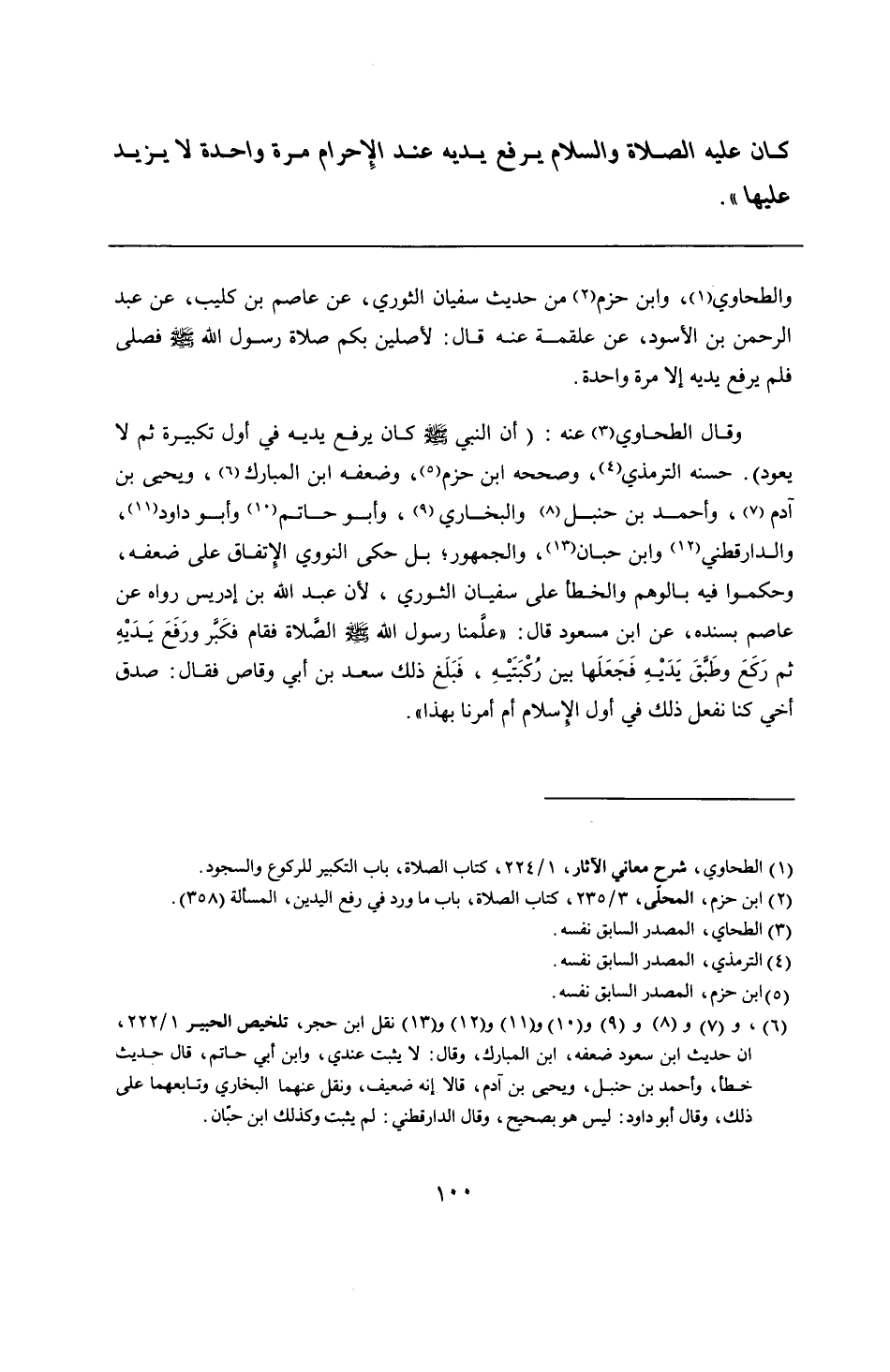 وقال الطحاوي عنه: (أن النبي - صلى الله عليه وسلم - كان يرفع يديه في أول تكبيرة ثم لا يعود). حسنه الترمذي، وصححه ابن حزم، وضعفه ابن المبارك، ويحيى بن آدم، وأحمد بن حنبل والبخاري، وأبو حاتم وأبو داود، والدارقطني وابن حبان، والجمهور؛ بل حكى النووي الإِتفاق على ضعفه، وحكموا فيه بالوهم والخطأ على سفيان الثوري، لأن عبد الله بن إدريس رواه عن عاصم بسنده، عن ابن مسعود قال: "علَّمنا رسول الله - صلى الله عليه وسلم - الصَّلاة فقام فكَبَّر ورَفَعَ يَدَيْهِ ثم رَكَعَ وطَبَّقَ يَدَيْهِ فَجَعَلَها بين رُكْبَتَيْهِ، فَبَلَغ ذلك سعد بن أبي وقاص فقال: صدق أخي كنا نفعل ذلك في أول الإسلام أم أمرنا بهذا".
