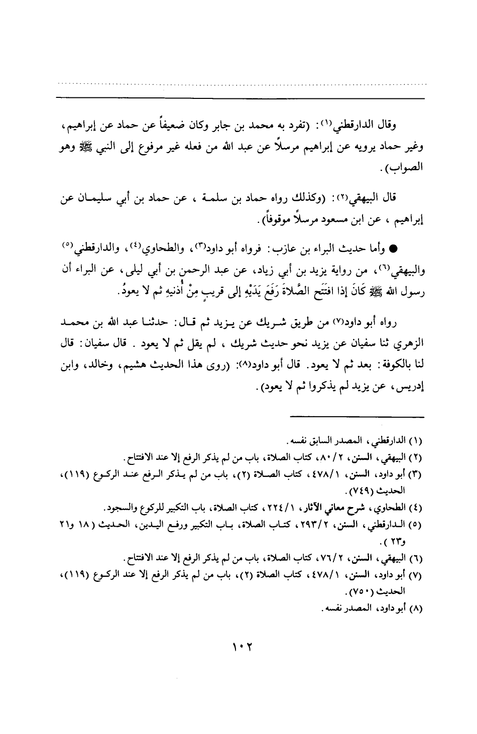 • وأما حديث البراء بن عازب: فرواه أبو داود، والطحاوي، والدارقطني والبيهقي، من رواية يزيد بن أبي زياد، عن عبد الرحمن بن أبي ليلى، عن البراء أن رسول الله - صلى الله عليه وسلم - كَانَ إذا افتَتَح الصَّلاةَ رَفَعَ يَدَيْهِ إلى قريبٍ مِنْ أُذنيهِ ثم لا يعودُ.