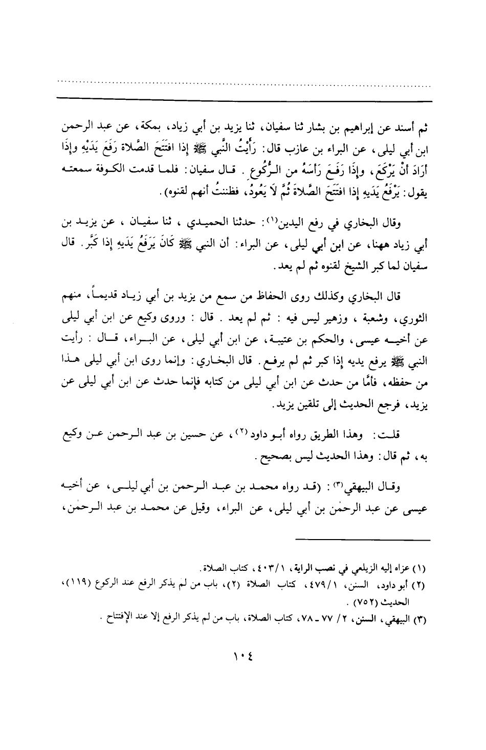 ثم أسند عن إبراهيم بن بشار ثنا سفيان، ثنا يزيد بن أبي زياد، بمكة، عن عبد الرحمن ابن أبي ليلى، عن البراء بن عازب قال: رَأَيْتُ النَّبيِّ - صلى الله عليه وسلم - إِذا افتَتَحَ الصَّلاة رَفَعَ يَدَيْهِ وإِذَا أرَادَ أنْ يَرْكَعَ، واذَا رَفَعَ رَأسَهُ من الرُّكُوعِ. قال سفيان: فلما قدمت الكوفة سمعته يقول: يَرْفَعُ يَدَيهِ إذا افتَتَحَ الصَّلاةَ ثُمَّ لَا يَعُودُ، فظننتُ أنهم لقنوه).