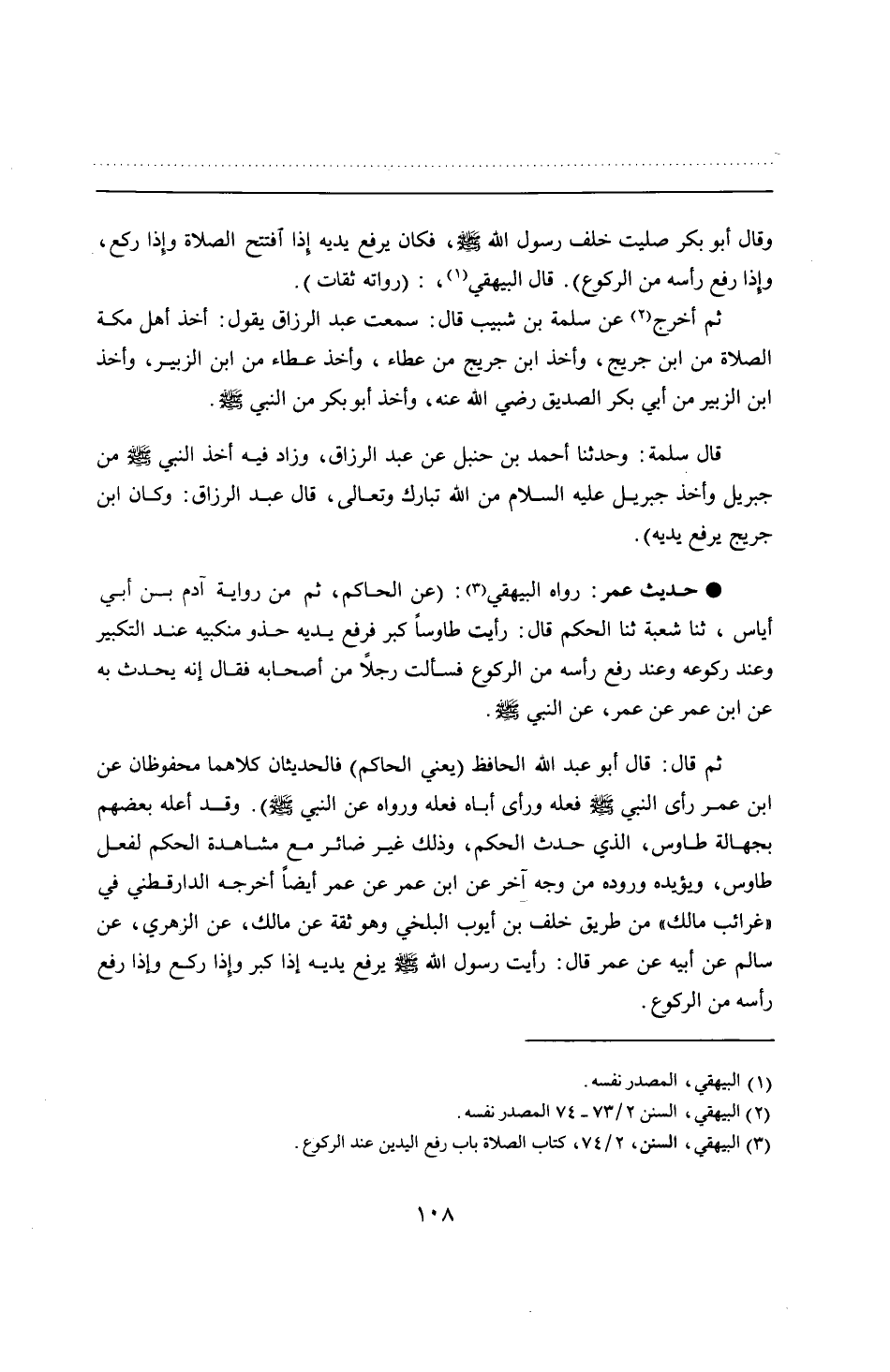 • حديث عمر: رواه البيهقي: (عن الحاكم، ثم من رواية آدم بن أبي أياس، ثنا شعبة ثنا الحكم قال: رأيت طاوسًا كبر فرفع يديه حذو منكبيه عند التكبير وعند ركوعه وعند رفع رأسه من الركوع فسألت رجلًا من أصحابه فقال إنه يحدث به عن ابن عمر عن عمر، عن النبي - صلى الله عليه وسلم -.