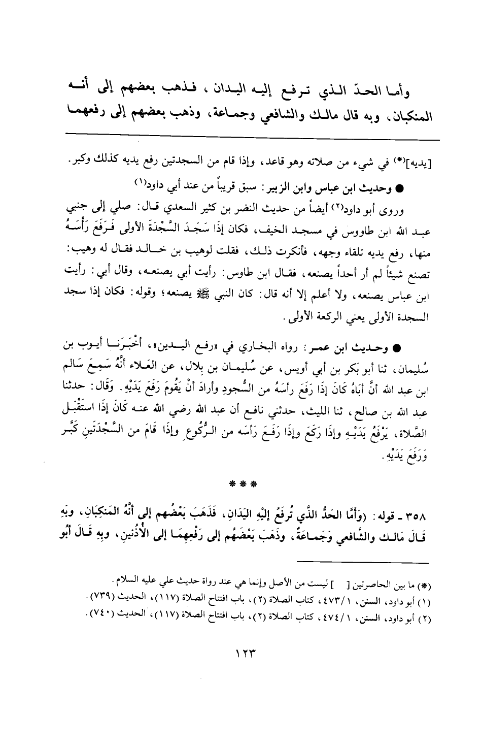 358 - قوله: (وَأَمَّا الحَدُّ الذَّي تُرفَعُ إليْهِ اليَدَانِ، فَذَهَبَ بَعْضُهم إلى أنَّهُ المَنكِبَانِ، وبَهِ قَالَ مَالك والشَّافعي وَجَماعَةٌ، وذهَبَ بَعْضَهُم إلى رَفْعِهِمَا إلى الأُذُنينِ، وبِهِ قَالَ أبُو
