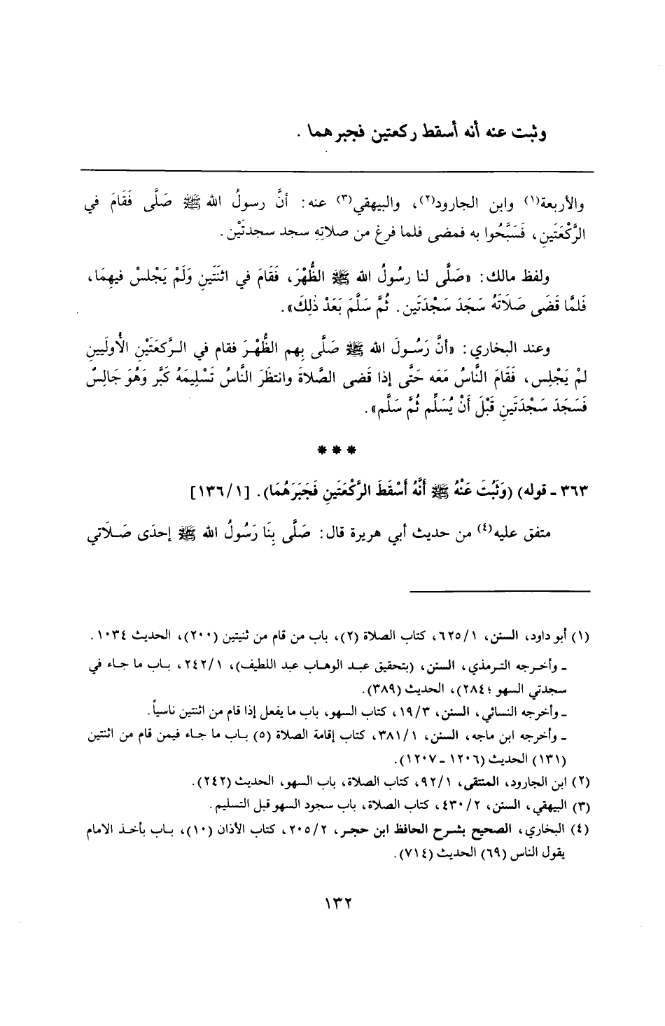 363 - قوله: (وَثَبُتَ عَنْهُ - صلى الله عليه وسلم - أَنَّهُ أسْقَطَ الرَّكْعَتَينِ فَجَبَرَهُمَا).
